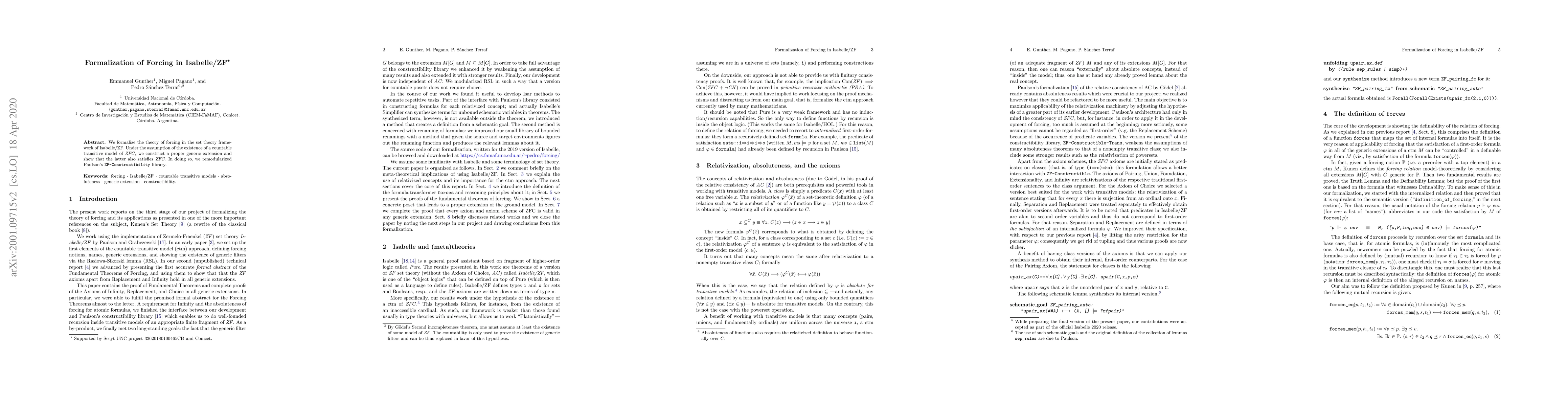 This paper formalizes the theory of forcing within Isabelle/ZF, constructing a proper generic extension from a countable transitive model of ZFC and demonstrating that it satisfies ZFC. The work also remodularized Paulson's existing ZF-Constructibility library.