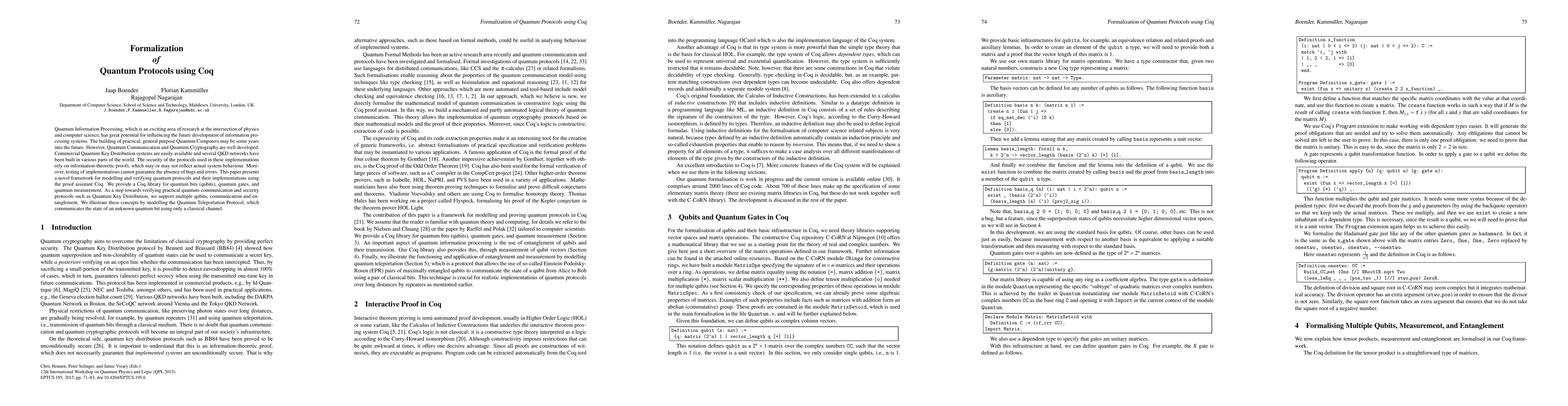 This paper introduces a Coq-based framework for modeling and verifying quantum protocols, including quantum key distribution, to ensure their security and correctness. It provides a library for qubits, quantum gates, and measurements, and demonstrates the framework by modeling the Quantum Teleportation Protocol.