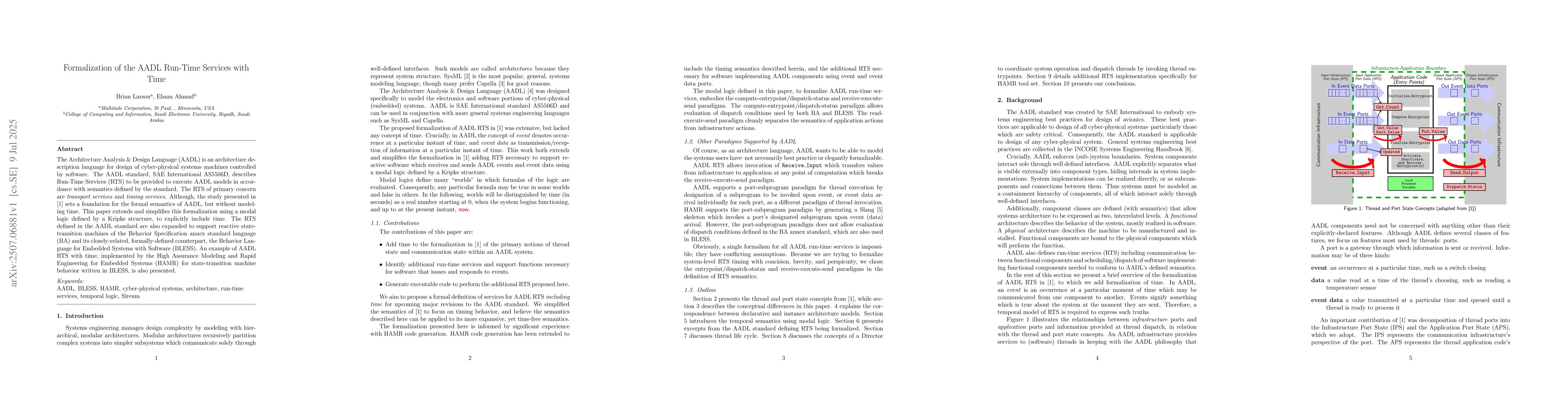 The Architecture Analysis & Design Language (AADL) is an architecture description language for design of cyber-physical systems--machines controlled by software. The AADL standard, SAE International AS5506D, describes Run-Time Services (RTS) to be provided to execute AADL models in accordance with semantics defined by the standard. The RTS of primary concern are transport services and timing services. Although, the study presented in [1] sets a foundation for the formal semantics of AADL, but without modeling time. This paper extends and simplifies this formalization using a modal logic defined by a Kripke structure, to explicitly include time. The RTS defined in the AADL standard are also expanded to support reactive state-transition machines of the Behavior Specification annex standard language (BA) and its closely-related, formally-defined counterpart, the Behavior Language for Embedded Systems with Software (BLESS). An example of AADL RTS with time, implemented by the High Assurance Modeling and Rapid Engineering for Embedded Systems (HAMR) for state-transition machine behavior written in BLESS, is also presented.
