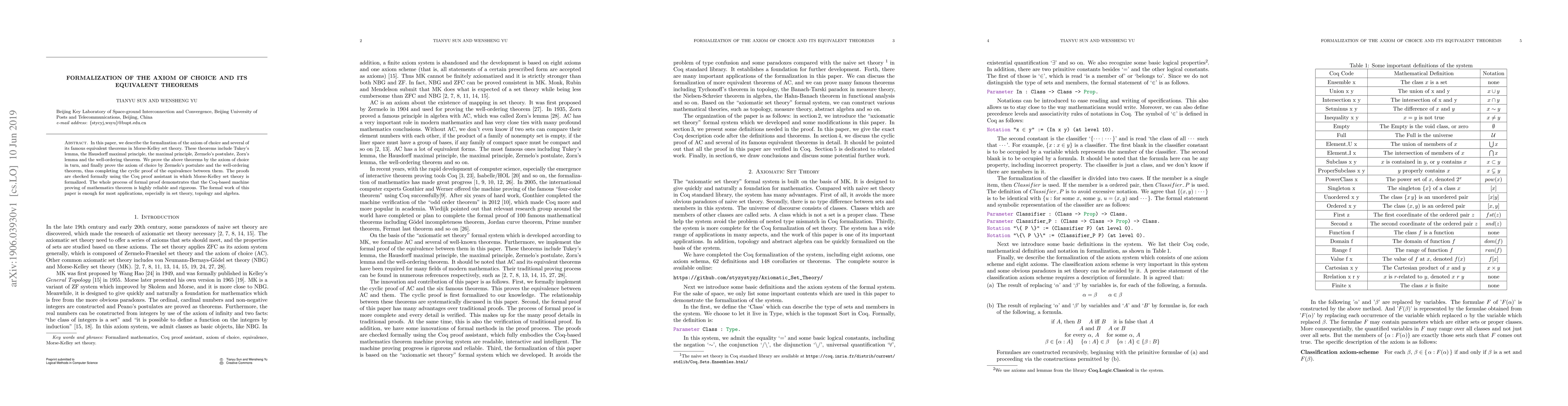 This paper formalizes the axiom of choice and several equivalent theorems in Morse-Kelley set theory, proving their equivalence using the Coq proof assistant. The formalization demonstrates the reliability and rigor of machine-assisted mathematical proofs in set theory, topology, and algebra.