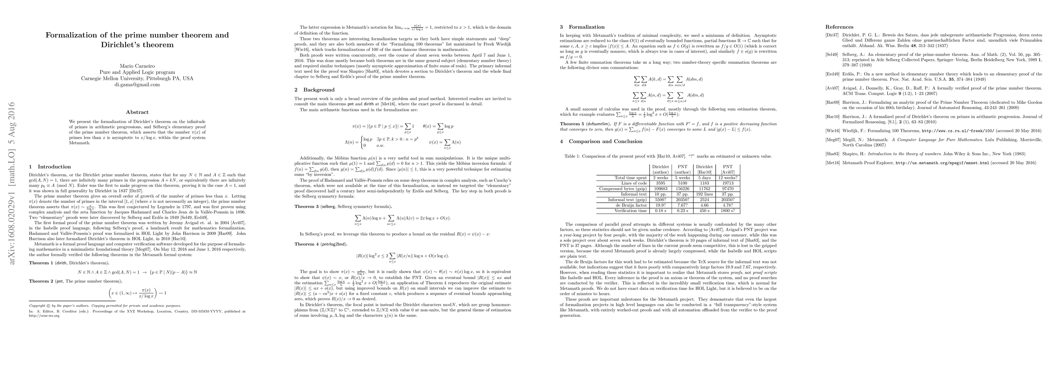 We present the formalization of Dirichlet's theorem on the infinitude of primes in arithmetic progressions, and Selberg's elementary proof of the prime number theorem, which asserts that the number $\pi(x)$ of primes less than $x$ is asymptotic to $x/\log x$, within the proof system Metamath.