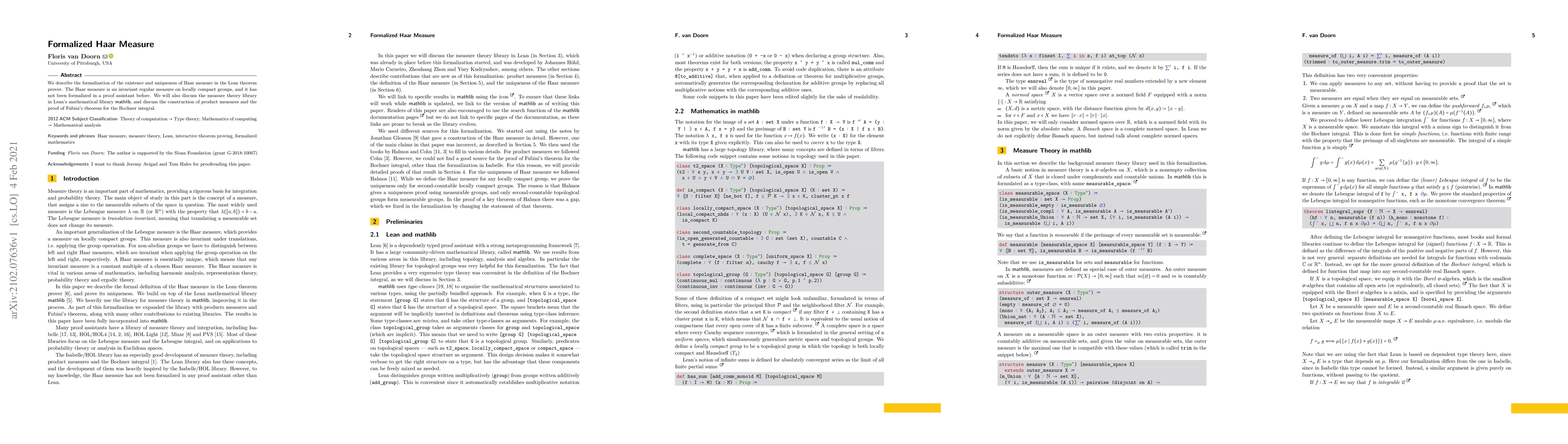 This paper formalizes the existence and uniqueness of Haar measure for locally compact groups in Lean, marking the first formalization of this concept in a proof assistant. It also explores Lean's \textsf{mathlib} measure theory library, including the construction of product measures and the proof of Fubini's theorem for the Bochner integral.