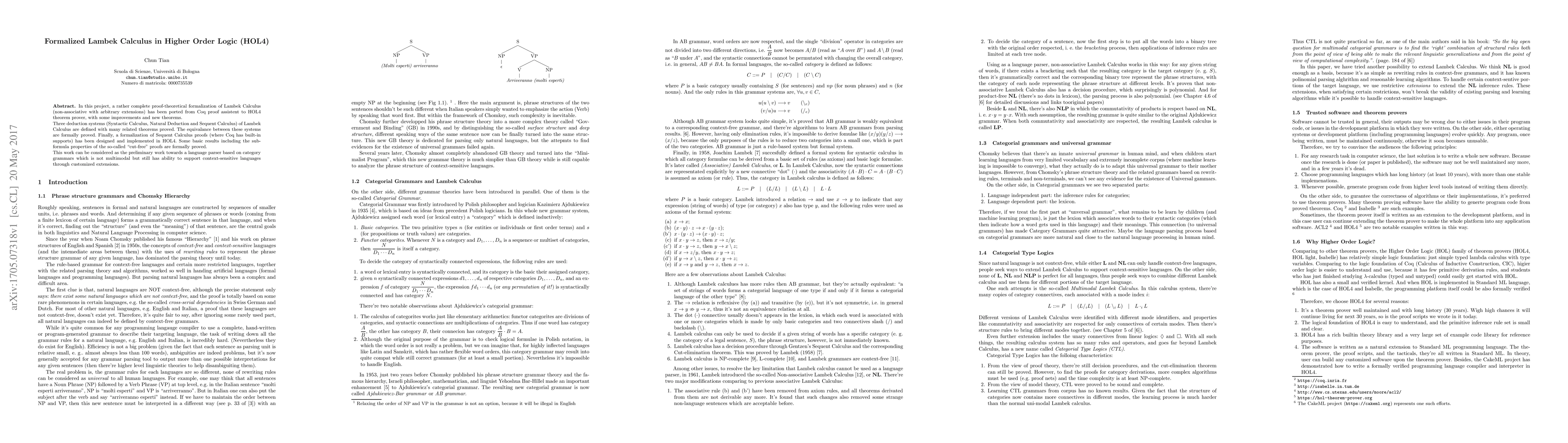 In this project, a rather complete proof-theoretical formalization of Lambek Calculus (non-associative with arbitrary extensions) has been ported from Coq proof assistent to HOL4 theorem prover, with some improvements and new theorems. Three deduction systems (Syntactic Calculus, Natural Deduction and Sequent Calculus) of Lambek Calculus are defined with many related theorems proved. The equivalance between these systems are formally proved. Finally, a formalization of Sequent Calculus proofs (where Coq has built-in supports) has been designed and implemented in HOL4. Some basic results including the sub-formula properties of the so-called "cut-free" proofs are formally proved. This work can be considered as the preliminary work towards a language parser based on category grammars which is not multimodal but still has ability to support context-sensitive languages through customized extensions.