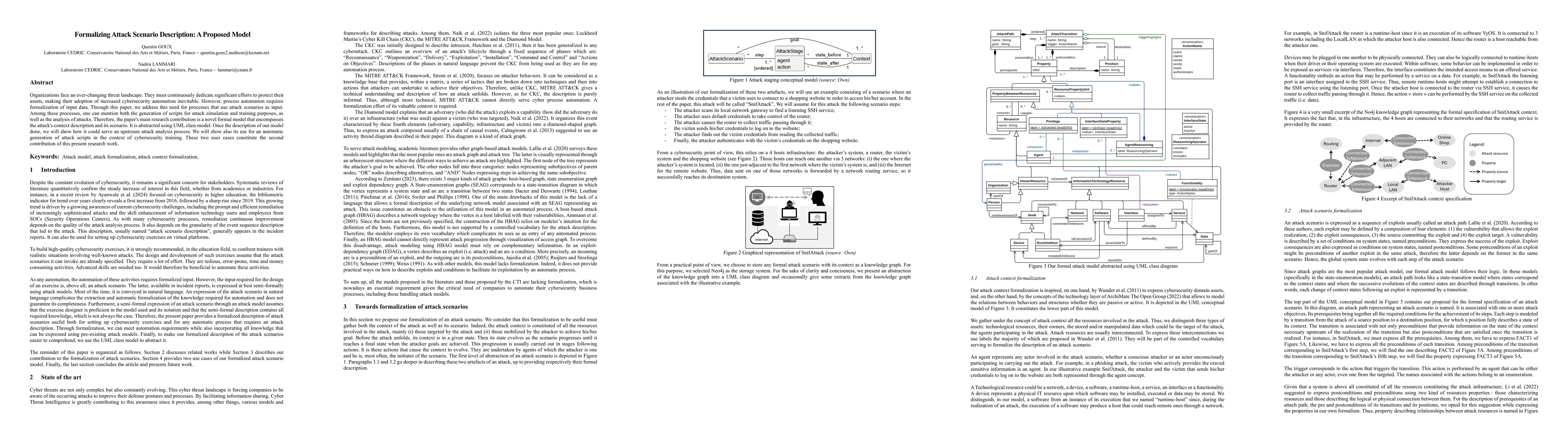 This paper introduces a formal model using UML class diagrams to describe attack scenarios, aiding in cybersecurity automation. The model supports both upstream attack analysis and automatic generation of attack scripts for training purposes.