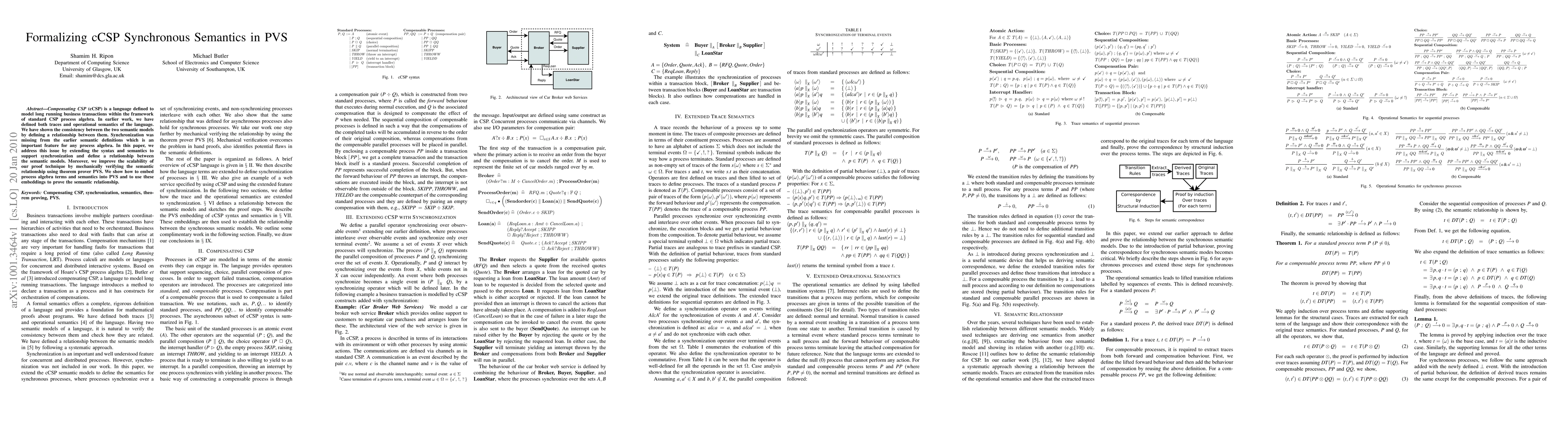 This paper extends the semantics of Compensating CSP (cCSP) to include synchronization, addressing a missing feature in earlier models. It uses PVS theorem prover to mechanically verify the consistency between the new synchronous semantics and existing operational models, enhancing the scalability and rigor of the formalization.