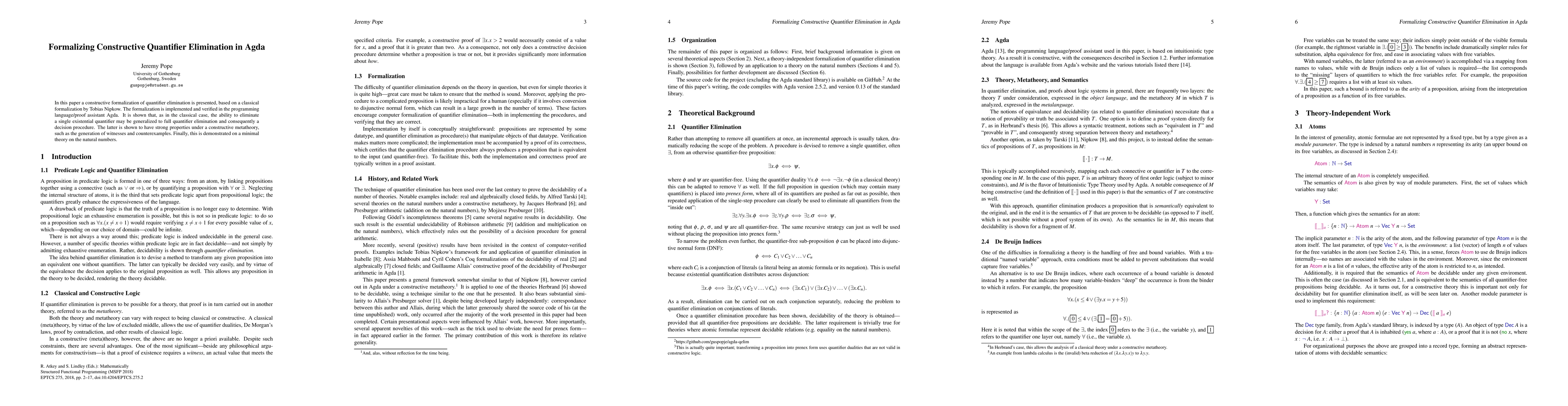 This paper presents a constructive formalization of quantifier elimination implemented in Agda, extending classical methods by Tobias Nipkow. It generalizes the elimination of existential quantifiers to full quantifier elimination, providing a decision procedure with constructive properties like witness generation.