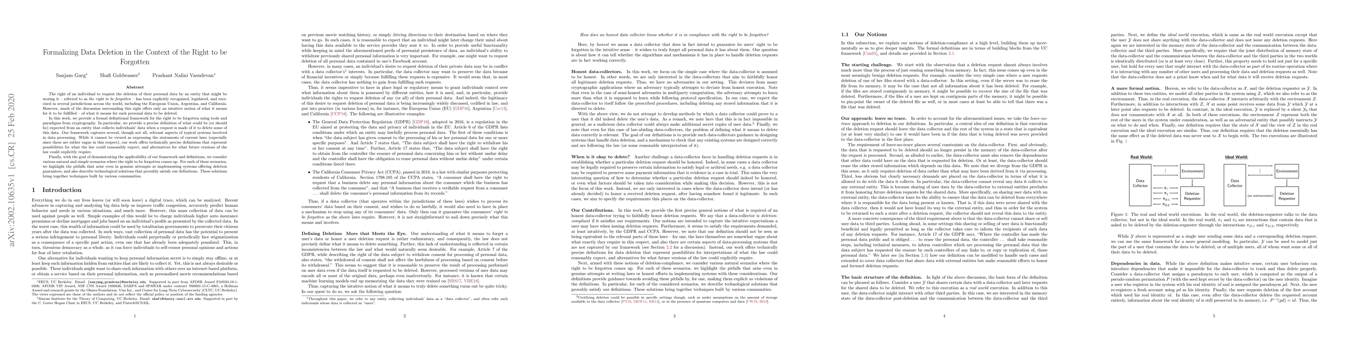 This paper formalizes the right to be forgotten by defining precise criteria for data deletion using cryptographic tools. It provides a framework that outlines what entities should do when data deletion requests are made, highlighting potential implementation challenges and offering technological solutions.