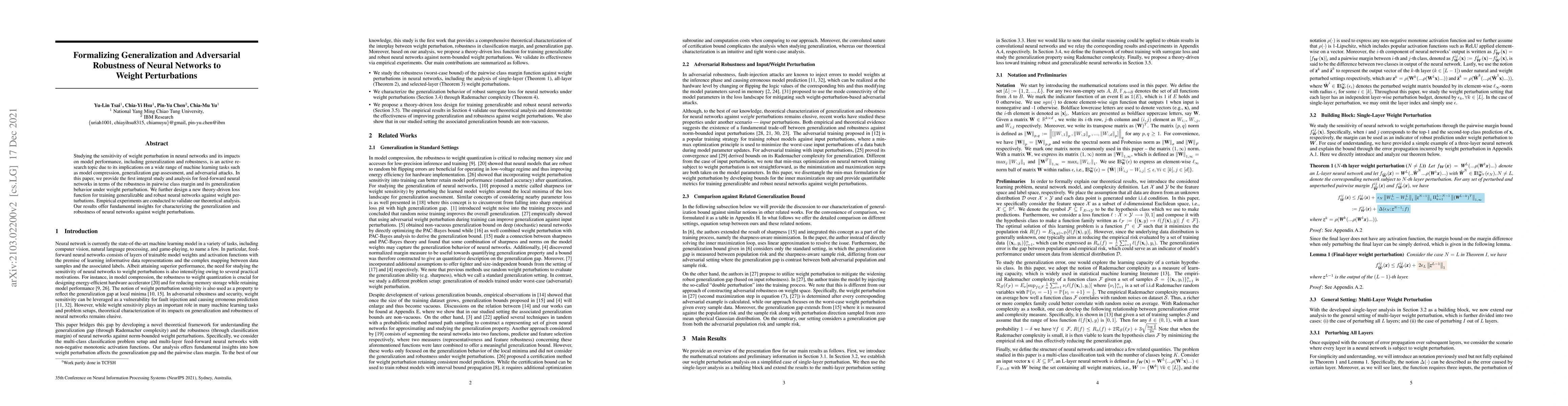 This paper investigates the impact of weight perturbations on neural network performance, focusing on generalization and robustness. It introduces a new theory-driven loss function to enhance robustness against such perturbations and validates the approach through empirical experiments, providing foundational insights into neural network behavior under weight changes.