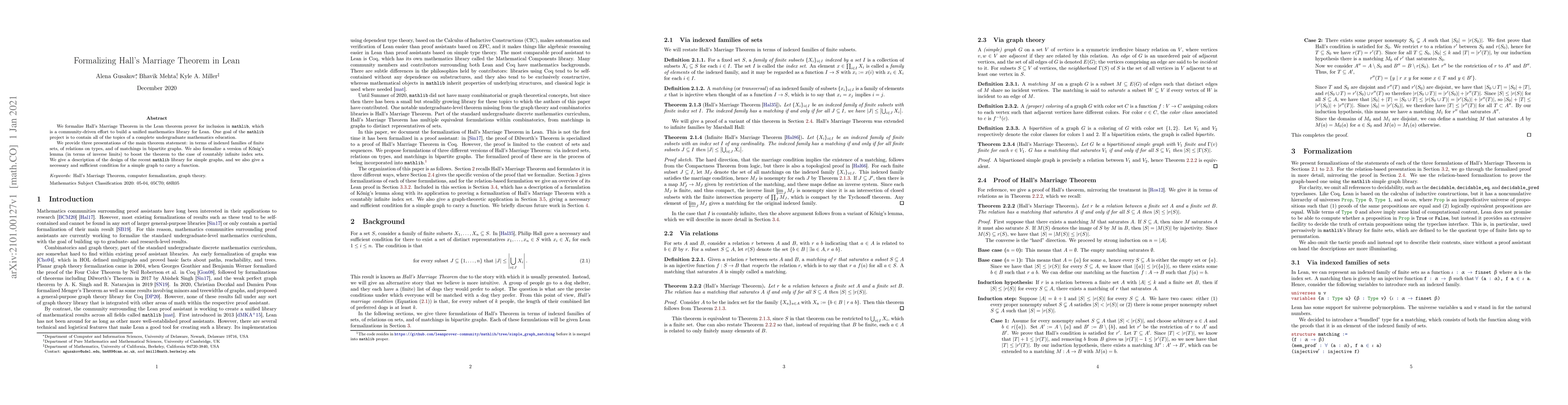 This paper formalizes Hall's Marriage Theorem in Lean, contributing to the mathlib project, which aims for a comprehensive undergraduate mathematics library. It presents three interpretations of the theorem and includes a version of Kőnig's lemma for countably infinite cases, alongside an overview of the mathlib library for simple graphs.