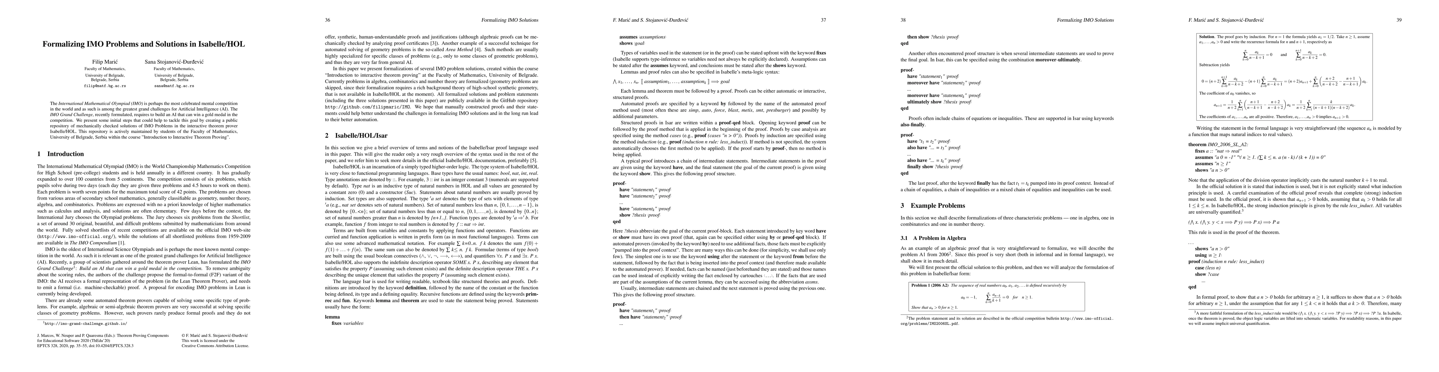 The paper presents a systematic approach to formalizing IMO problems and solutions in Isabelle/HOL, demonstrating the practical application of interactive theorem proving in education and AI research.