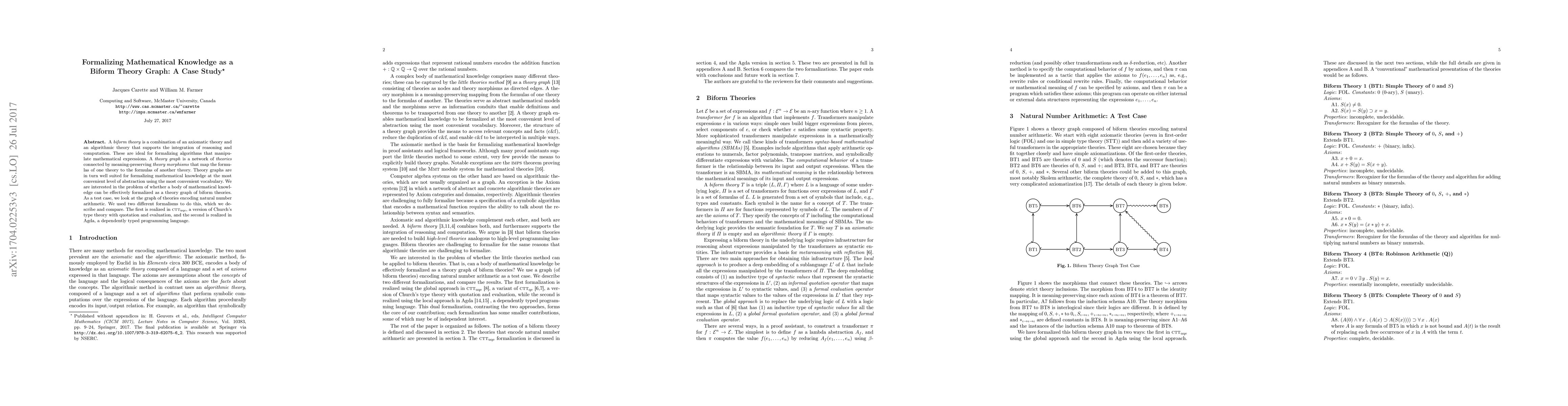 This paper explores formalizing mathematical knowledge using biform theory graphs, combining axiomatic and algorithmic theories. It tests this approach by formalizing natural number arithmetic, comparing two different formalisms: CTT uqe and Agda.