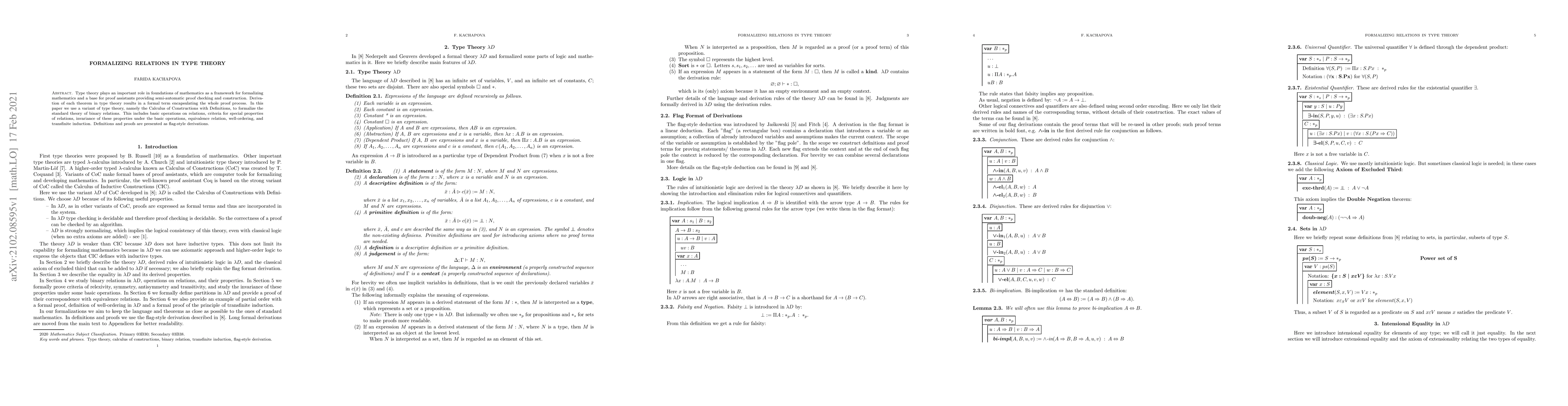 This paper uses a variant of type theory to formalize binary relations in mathematics, including basic operations and special properties, providing a rigorous framework for proof assistants.