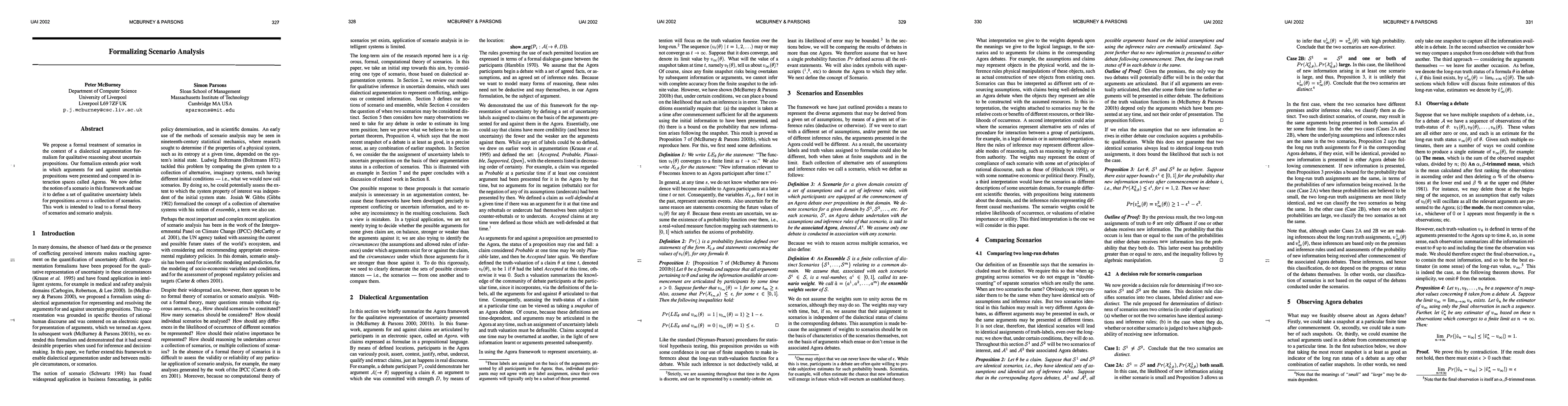 We propose a formal treatment of scenarios in the context of a dialectical argumentation formalism for qualitative reasoning about uncertain propositions. Our formalism extends prior work in which arguments for and against uncertain propositions were presented and compared in interaction spaces called Agoras. We now define the notion of a scenario in this framework and use it to define a set of qualitative uncertainty labels for propositions across a collection of scenarios. This work is intended to lead to a formal theory of scenarios and scenario analysis.