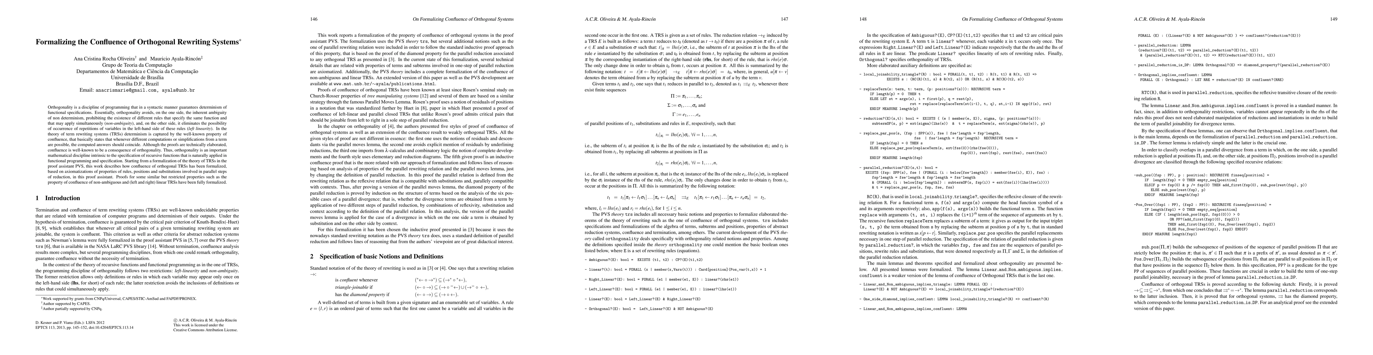 This paper formalizes the confluence of orthogonal rewriting systems in the proof assistant PVS, emphasizing properties like non-ambiguity and left linearity that ensure determinism. It presents formal proofs for the confluence of such systems and related properties in orthogonal term rewriting systems.