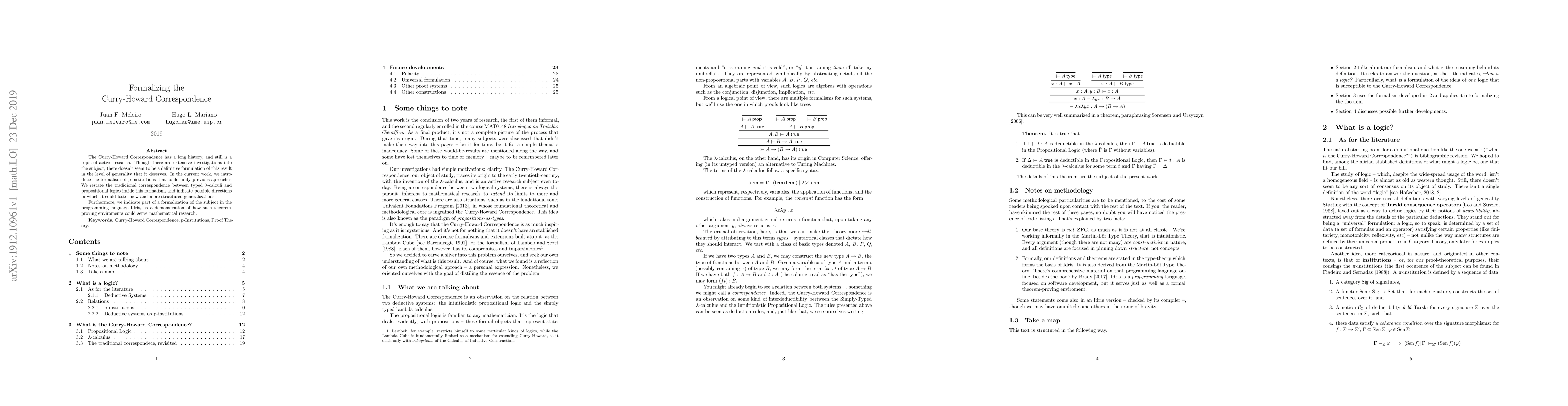 The Curry-Howard Correspondence has a long history, and still is a topic of active research. Though there are extensive investigations into the subject, there doesn't seem to be a definitive formulation of this result in the level of generality that it deserves. In the current work, we introduce the formalism of p-institutions that could unify previous aproaches. We restate the tradicional correspondence between typed $\lambda$-calculi and propositional logics inside this formalism, and indicate possible directions in which it could foster new and more structured generalizations. Furthermore, we indicate part of a formalization of the subject in the programming-language Idris, as a demonstration of how such theorem-proving enviroments could serve mathematical research.