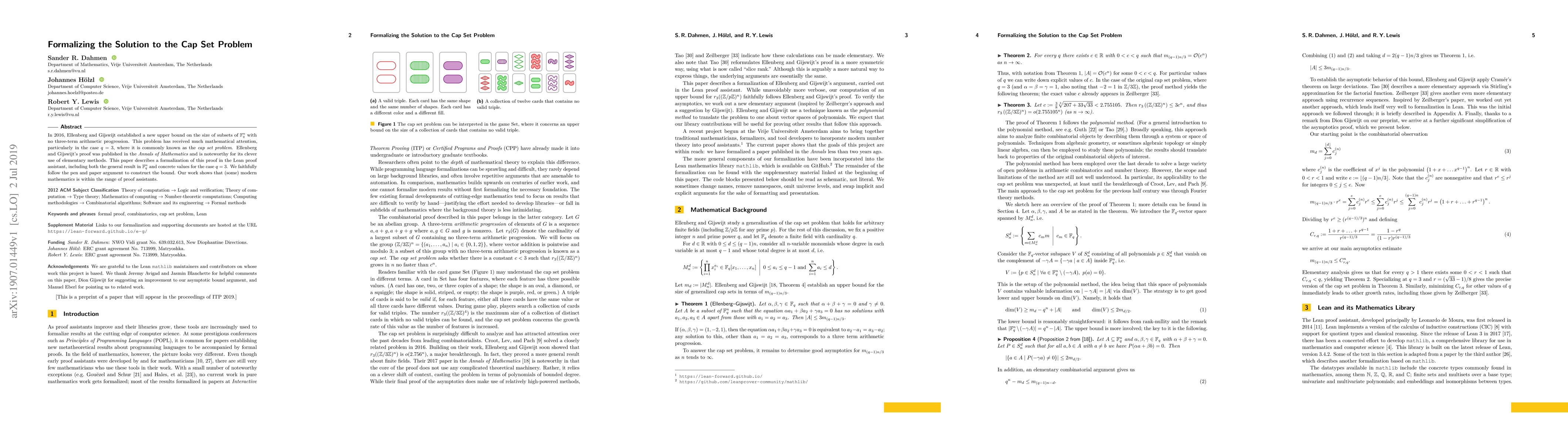 The paper presents a formalization of Ellenberg and Gijswijt's solution to the cap set problem, including both the general result in $\mathbb{F}^n_q$ and the specific case for $q = 3$, using the Lean proof assistant.