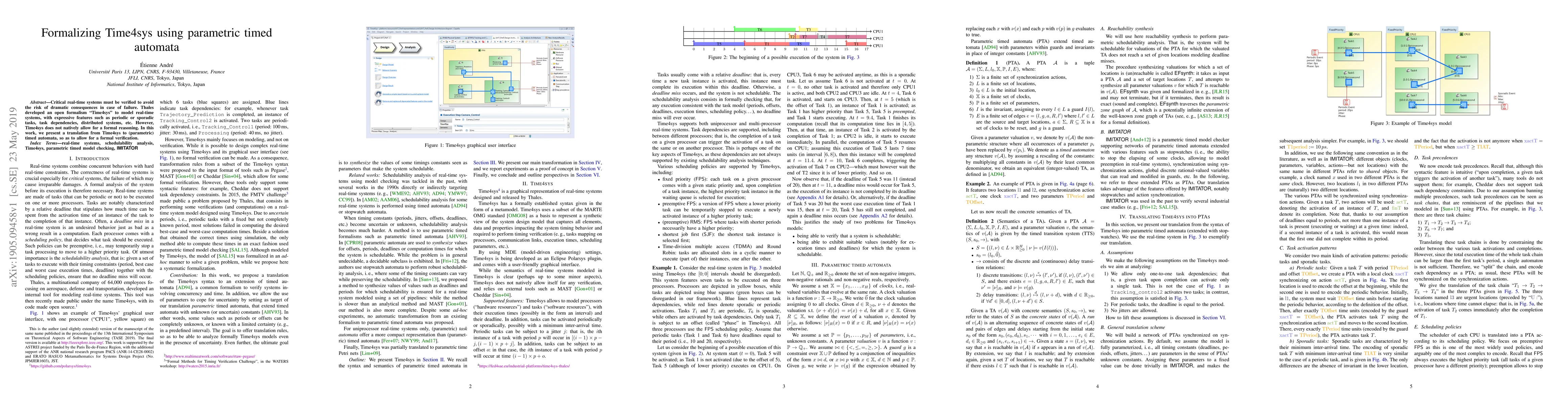 Critical real-time systems must be verified to avoid the risk of dramatic consequences in case of failure. Thales developed an open formalism Time4sys to model real-time systems, with expressive features such as periodic or sporadic tasks, task dependencies, distributed systems, etc. However, Time4sys does not natively allow for a formal reasoning. In this work, we present a translation from Time4sys to (parametric) timed automata, so as to allow for a formal verification.