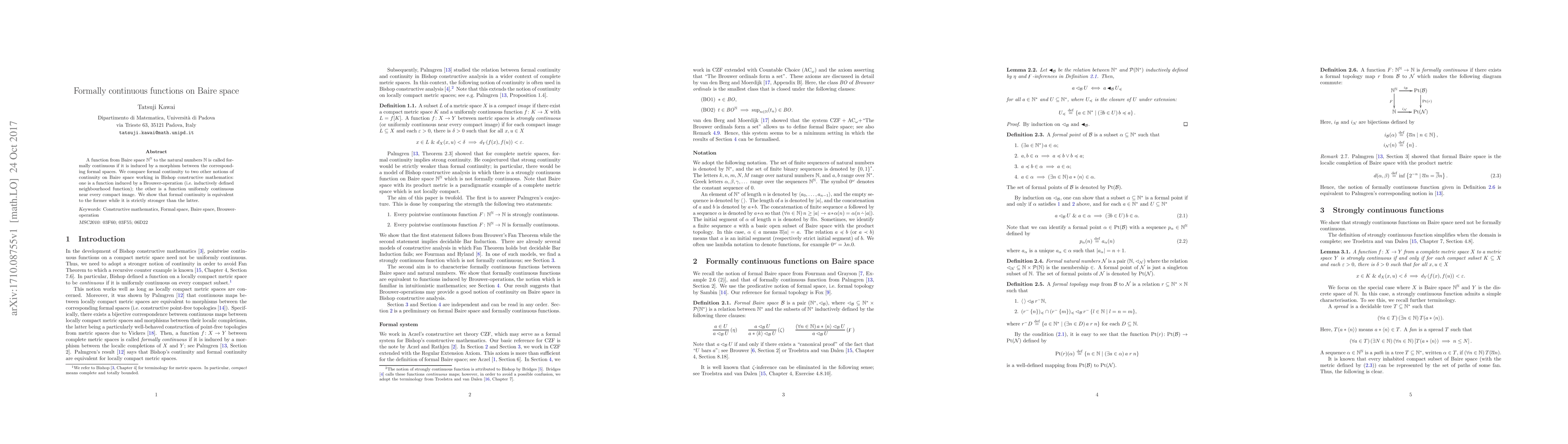 This paper explores formally continuous functions on Baire space, showing they are equivalent to functions induced by Brouwer-operations but strictly stronger than those uniformly continuous near every compact image within Bishop constructive mathematics.