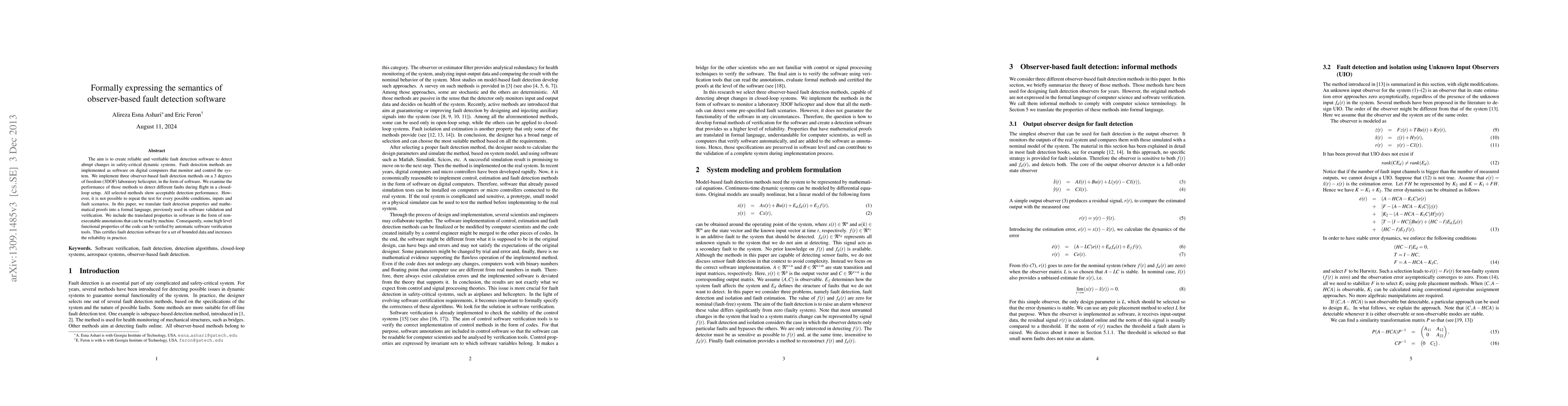 This paper develops reliable fault detection software for safety-critical dynamic systems using observer-based methods, tested on a 3DOF helicopter. It formalizes the software's fault detection properties into a machine-readable language, enhancing verification and reliability through automatic software tools.