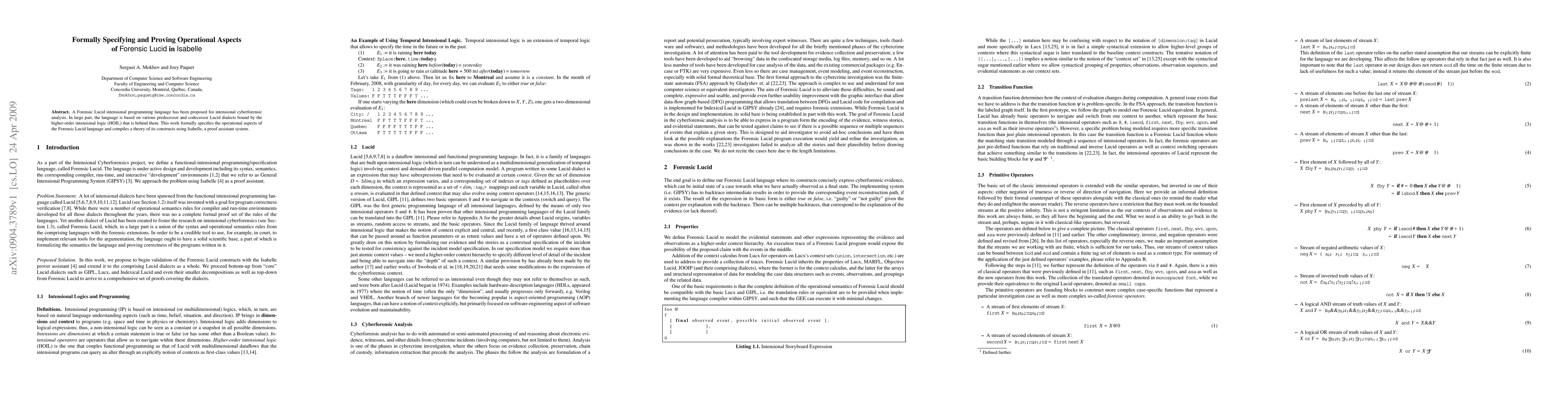 This paper formally specifies the operational aspects of the Forensic Lucid programming language using Isabelle, a proof assistant, and compiles a theory of its constructs to ensure rigorous verification of its intensional cyberforensic analysis capabilities.