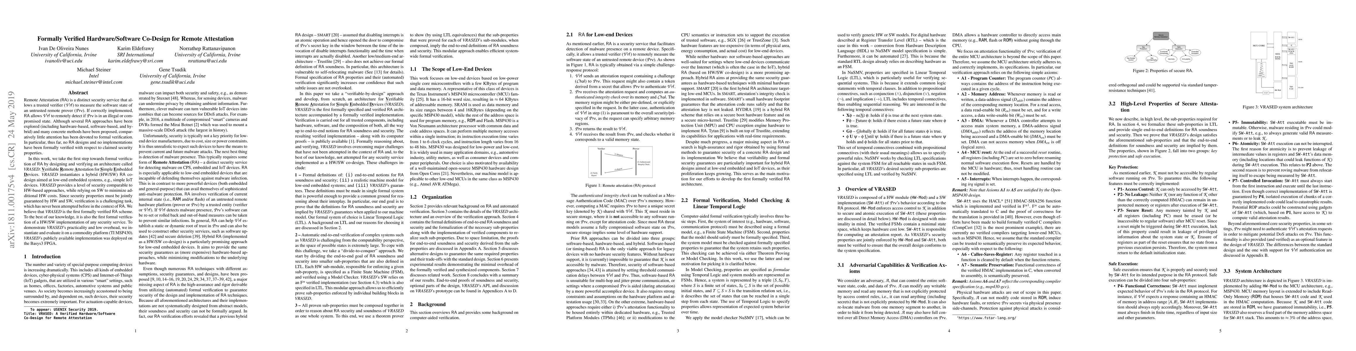 This paper presents VRASED, the first formally verified hybrid hardware/software co-design for Remote Attestation aimed at low-end embedded systems, demonstrating security comparable to hardware-only approaches with minimal hardware costs. The authors evaluate VRASED on a commodity platform and an FPGA, showcasing its practicality and low overhead.