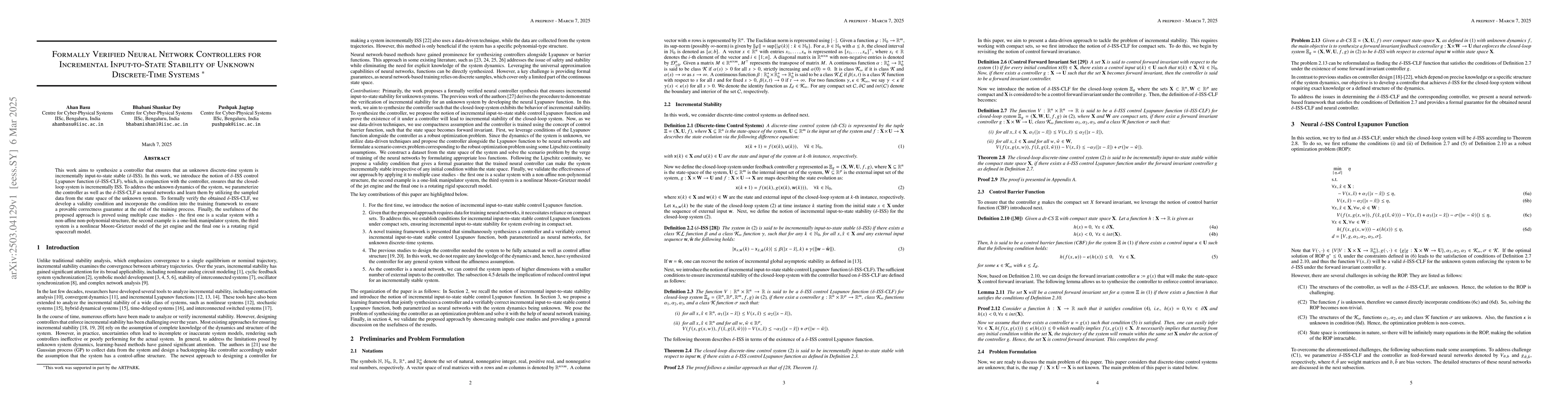 This research presents a novel approach by combining formal verification with neural network-based controllers for ensuring incremental input-to-state stability in unknown discrete-time systems.