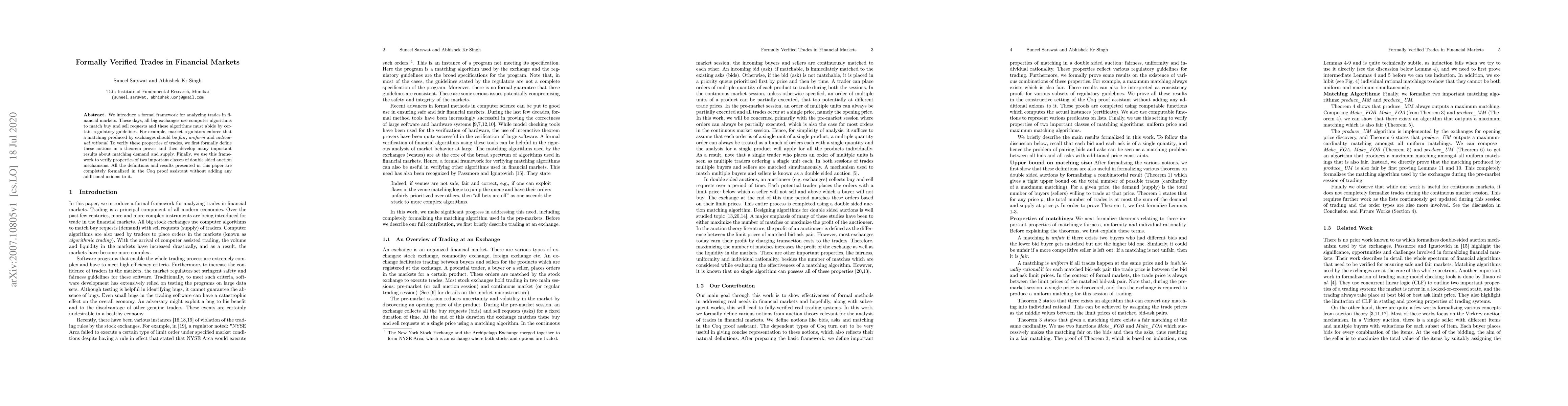 The paper presents a formalized framework using the Coq proof assistant to verify properties of matching algorithms in financial markets, ensuring fairness, uniformity, and individual rationality.