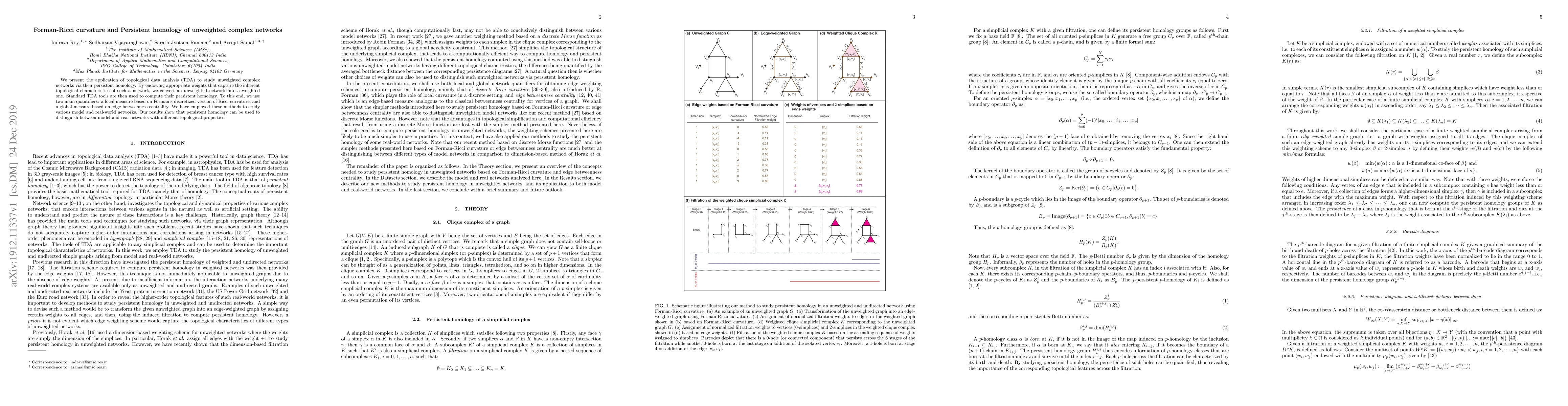 The paper applies topological data analysis (TDA) to unweighted complex networks by assigning weights based on Forman-Ricci curvature and edge betweenness centrality, then computing persistent homology. The method can distinguish between model and real-world networks based on their topological properties.