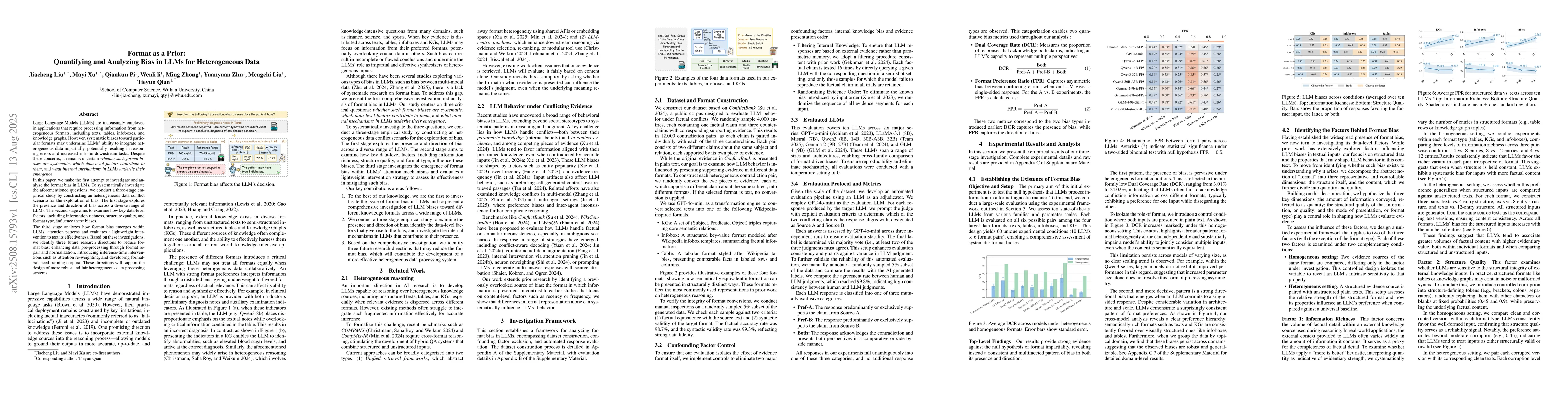 Large Language Models (LLMs) are increasingly employed in applications that require processing information from heterogeneous formats, including text, tables, infoboxes, and knowledge graphs. However, systematic biases toward particular formats may undermine LLMs' ability to integrate heterogeneous data impartially, potentially resulting in reasoning errors and increased risks in downstream tasks. Despite these concerns, it remains uncertain whether such format biases are systematic, which data-level factors contribute to them, and what internal mechanisms in LLMs underlie their emergence. In this paper, we make the first attempt to investigate and analyze the format bias in LLMs. To systematically investigate the aforementioned questions, we conduct a three-stage empirical study by constructing an heterogeneous data conflict scenario for the exploration of bias. The first stage explores the presence and direction of bias across a diverse range of LLMs. The second stage aims to examine how key data-level factors, including information richness, structure quality, and format type, influence these biases. The third stage analyzes how format bias emerges within LLMs' attention patterns and evaluates a lightweight intervention to test its potential mitigability. Based on these investigations, we identify three future research directions to reduce format bias: improving data preprocessing through format sanitization and normalization, introducing inference-time interventions such as attention re-weighting, and developing format-balanced training corpora. These directions will support the design of more robust and fair heterogeneous data processing systems.