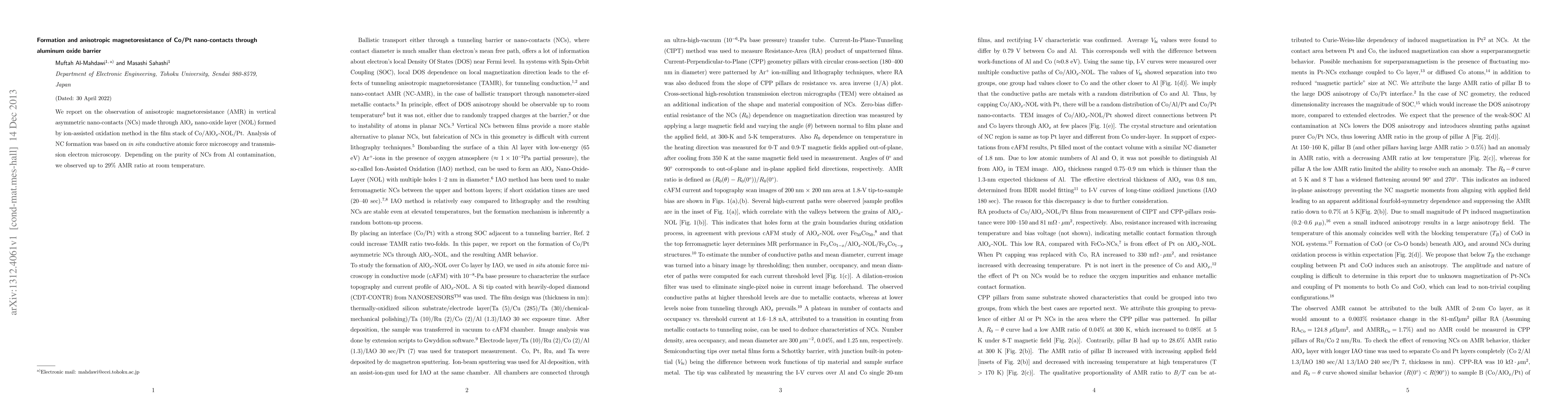 We report on the observation of anisotropic magnetoresistance (AMR) in vertical asymmetric nano-contacts (NCs) made through AlO$_x$ nano-oxide layer (NOL) formed by ion-assisted oxidation method in the film stack of Co/AlO$_x$-NOL/Pt. Analysis of NC formation was based on \emph{in situ} conductive atomic force microscopy and transmission electron microscopy. Depending on the purity of NCs from Al contamination, we observed up to 29% AMR ratio at room temperature.