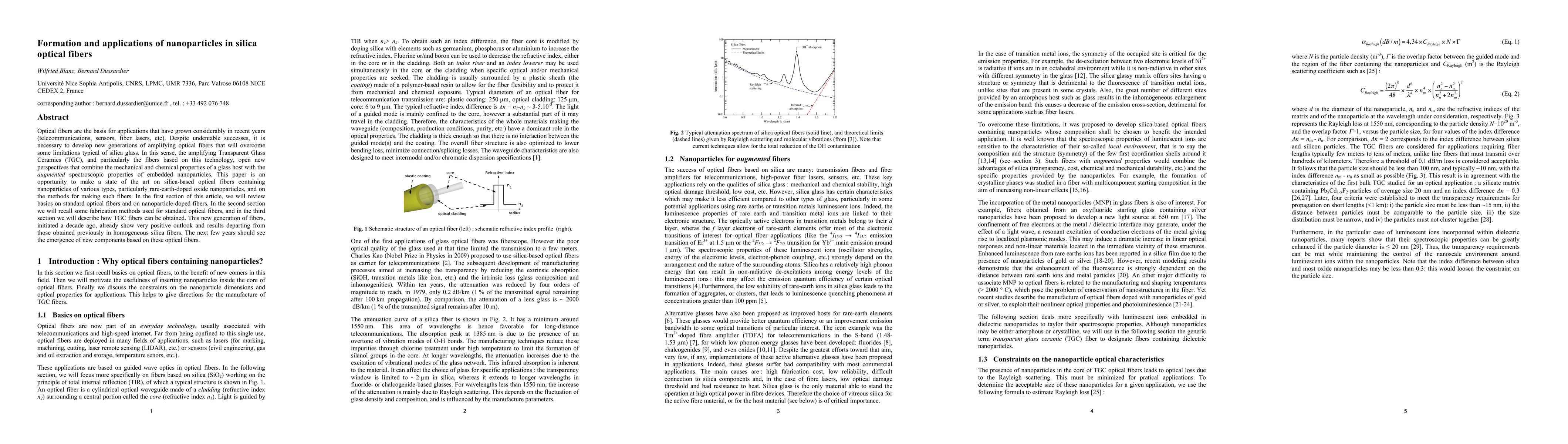 This paper reviews the formation and applications of nanoparticles embedded in silica optical fibers, focusing on Transparent Glass Ceramics (TGC) fibers that combine nanoparticles with glass hosts. It explores methods for creating these advanced fibers and highlights their potential in overcoming limitations of traditional silica fibers.