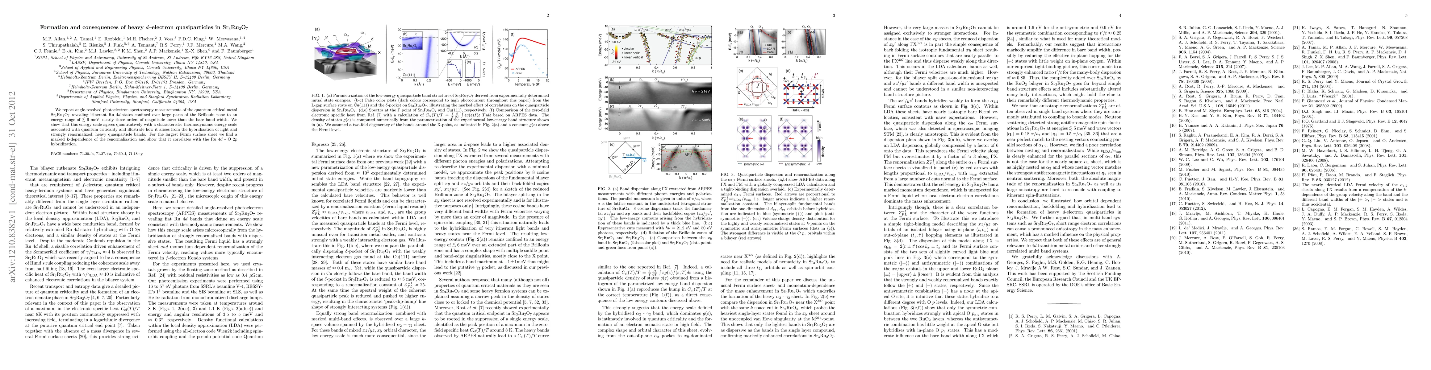 We report angle-resolved photoelectron spectroscopy measurements of the quantum critical metal Sr3Ru2O7 revealing itinerant Ru 4d-states confined over large parts of the Brillouin zone to an energy range of < 6 meV, nearly three orders of magnitude lower than the bare band width. We show that this energy scale agrees quantitatively with a characteristic thermodynamic energy scale associated with quantum criticality and illustrate how it arises from the hybridization of light and strongly renormalized, heavy quasiparticle bands. For the largest Fermi surface sheet we find a marked k-dependence of the renormalization and show that it correlates with the Ru 4d - O 2p hybridization.