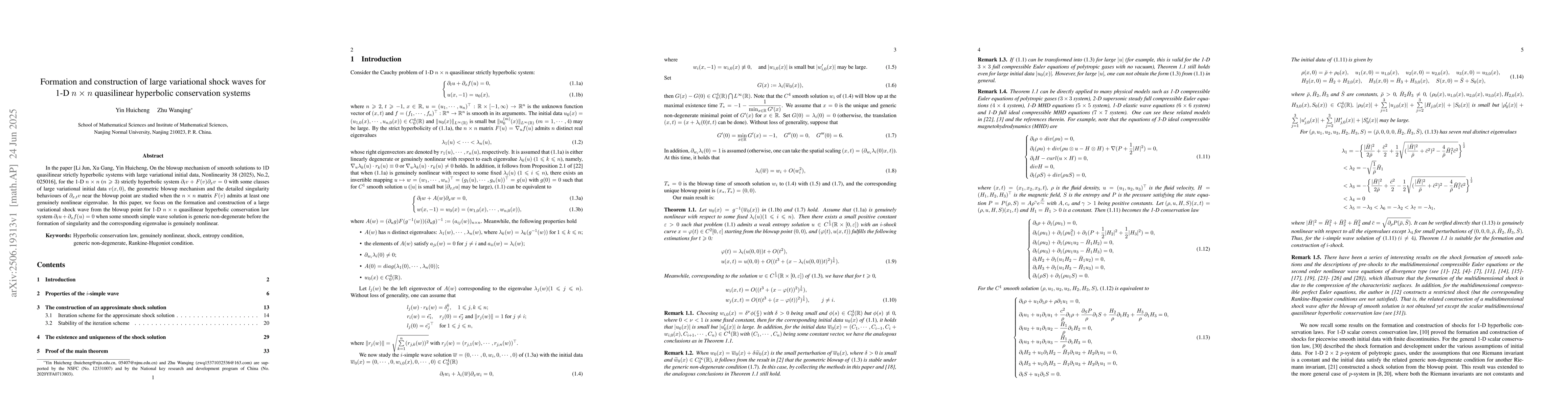 In the paper [Li Jun, Xu Gang, Yin Huicheng, On the blowup mechanism of smooth solutions to 1D quasilinear strictly hyperbolic systems with large variational initial data, Nonlinearity 38 (2025), No.2, 025016], for the 1-D $n\times n$ ($n\geqslant 3$) strictly hyperbolic system $\partial_tv+F(v)\partial_xv=0$ with some classes of large variational initial data $v(x, 0)$, the geometric blowup mechanism and the detailed singularity behaviours of $\partial_{x,t}v$ near the blowup point are studied when the $n\times n$ matrix $F(v)$ admits at least one genuinely nonlinear eigenvalue. In this paper, we focus on the formation and construction of a large variational shock wave from the blowup point for 1-D $n\times n$ quasilinear hyperbolic conservation law system $\partial_tu+\partial_xf(u)=0$ when some smooth simple wave solution is generic non-degenerate before the formation of singularity and the corresponding eigenvalue is genuinely nonlinear.