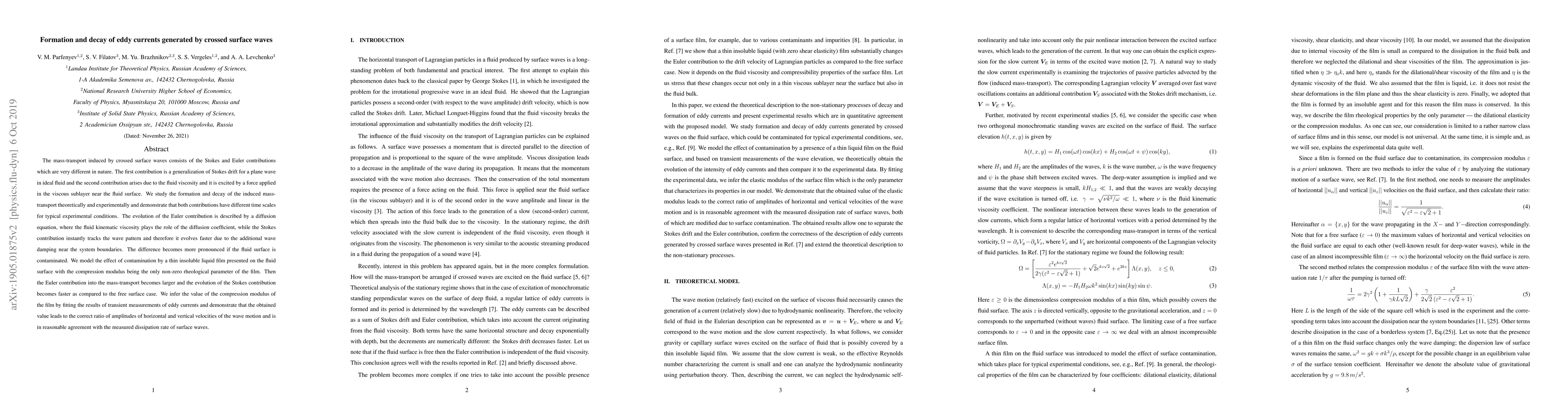 The mass-transport induced by crossed surface waves consists of the Stokes and Euler contributions which are very different in nature. The first contribution is a generalization of Stokes drift for a plane wave in ideal fluid and the second contribution arises due to the fluid viscosity and it is excited by a force applied in the viscous sublayer near the fluid surface. We study the formation and decay of the induced mass-transport theoretically and experimentally and demonstrate that both contributions have different time scales for typical experimental conditions. The evolution of the Euler contribution is described by a diffusion equation, where the fluid kinematic viscosity plays the role of the diffusion coefficient, while the Stokes contribution evolves faster, feeling the additional damping near the system boundaries. The difference becomes more pronounced if the fluid surface is contaminated. We model the effect of contamination by a thin insoluble liquid film presented on the fluid surface with the compression modulus being the only non-zero rheological parameter of the film. Then the Euler contribution into the mass-transport becomes parametrically larger and the evolution of the Stokes contribution becomes parametrically faster. The parameter is the same in both cases and it is equal to the quality factor of surfaces waves, which is modified by the presence of a surface film. We infer the value of the compression modulus of the film by fitting the results of transient measurements of eddy currents and demonstrate that the obtained value leads to the correct ratio of amplitudes of horizontal and vertical velocities of the wave motion and is in reasonable agreement with the measured dissipation rate of surface waves.