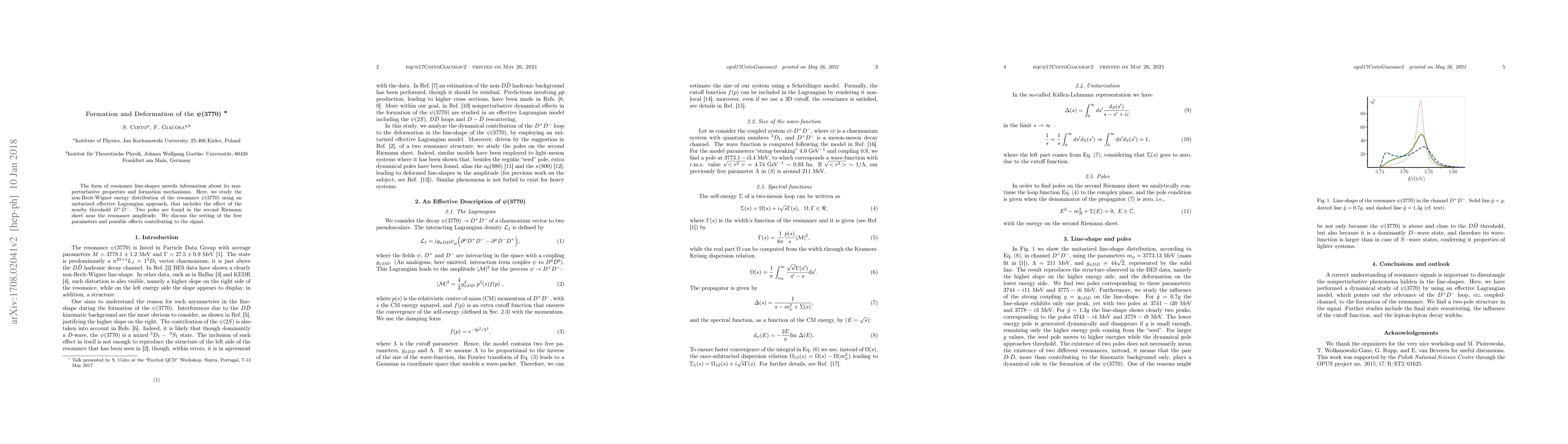 The form of resonance line-shapes unveils information about its nonperturbative properties and formation mechanisms. Here, we study the non-Breit-Wigner energy distribution of the resonance $\psi (3770)$ using an unitarized effective Lagrangian approach, that includes the effect of the nearby threshold $D^{+}D^{-}$. Two poles are found in the second Riemann sheet near the resonance amplitude. We discuss the setting of the free parameters and possible effects contributing to the signal.