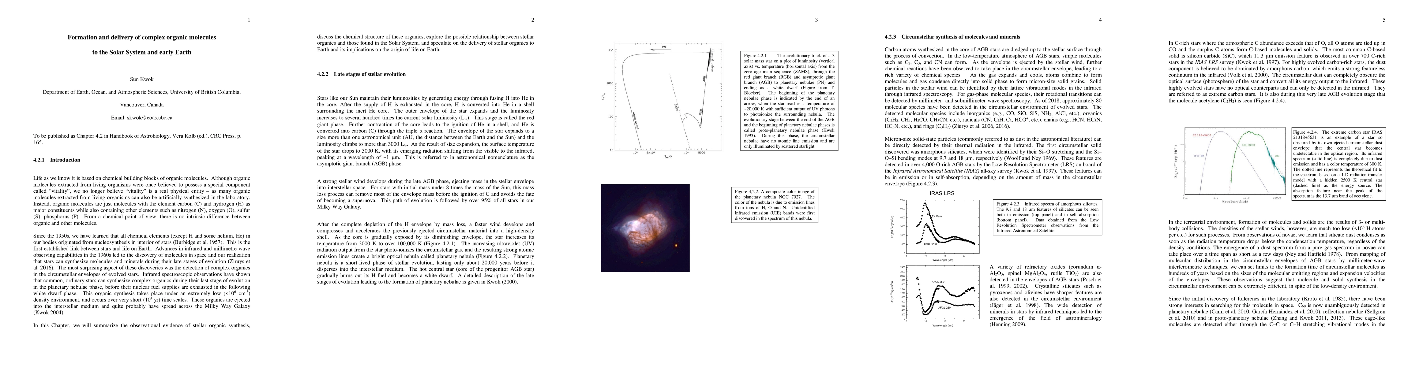 The late stages of stellar evolution from asymptotic giant branch stars to planetary nebulae are now known to be an active phase of molecular synthesis. Over 80 gas-phase molecules have been detected through rotational transitions in the mm/submm region. Infrared spectroscopy has also detected inorganic minerals, fullerenes, and organic solids. The synthesis of these molecules and solids take place over very low density ($<10^6$ cm$^{-3}$) and short ($\sim10^3$ yr) time scales. The complex organics are observed to have mixed aromatic/aliphatic structures and may be related to the complex organics found in meteorites, comets, interplanetary dust particles, and planetary satellites. The possible links between stellar and solar system organics is discussed.