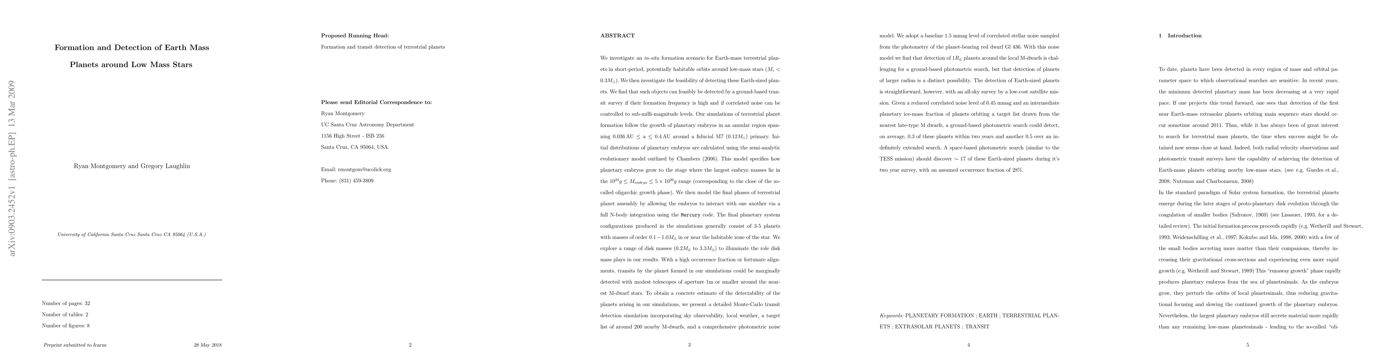 This paper explores the formation of Earth-mass planets around low-mass stars and assesses their detectability. Simulations suggest that such planets can form in habitable orbits, but ground-based detection is challenging, while a space-based mission could identify many of these Earth-sized planets.