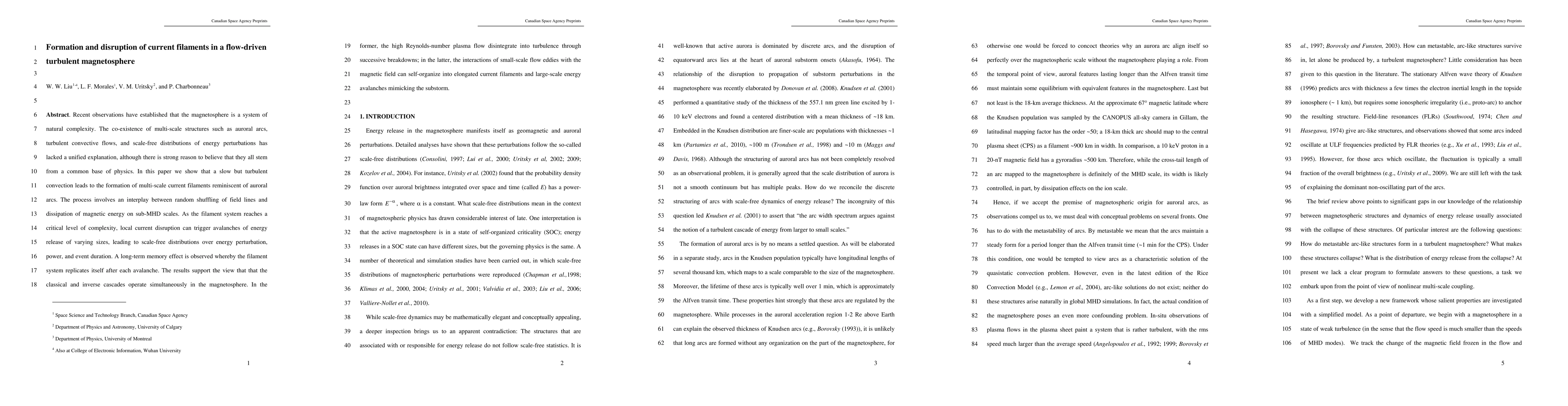 Recent observations have established that the magnetosphere is a system of natural complexity. The co-existence of multi-scale structures such as auroral arcs, turbulent convective flows, and scale-free distributions of energy perturbations has lacked a unified explanation, although there is strong reason to believe that they all stem from a common base of physics. In this paper we show that a slow but turbulent convection leads to the formation of multi-scale current filaments reminiscent of auroral arcs. The process involves an interplay between random shuffling of field lines and dissipation of magnetic energy on sub-MHD scales. As the filament system reaches a critical level of complexity, local current disruption can trigger avalanches of energy release of varying sizes, leading to scale-free distributions over energy perturbation, power, and event duration. A long-term memory effect is observed whereby the filament system replicates itself after each avalanche. The results support the view that that the classical and inverse cascades operate simultaneously in the magnetosphere. In the former, the high Reynolds-number plasma flow disintegrate into turbulence through successive breakdowns; in the latter, the interactions of small-scale flow eddies with the magnetic field can self-organize into elongated current filaments and large-scale energy avalanches mimicking the substorm.