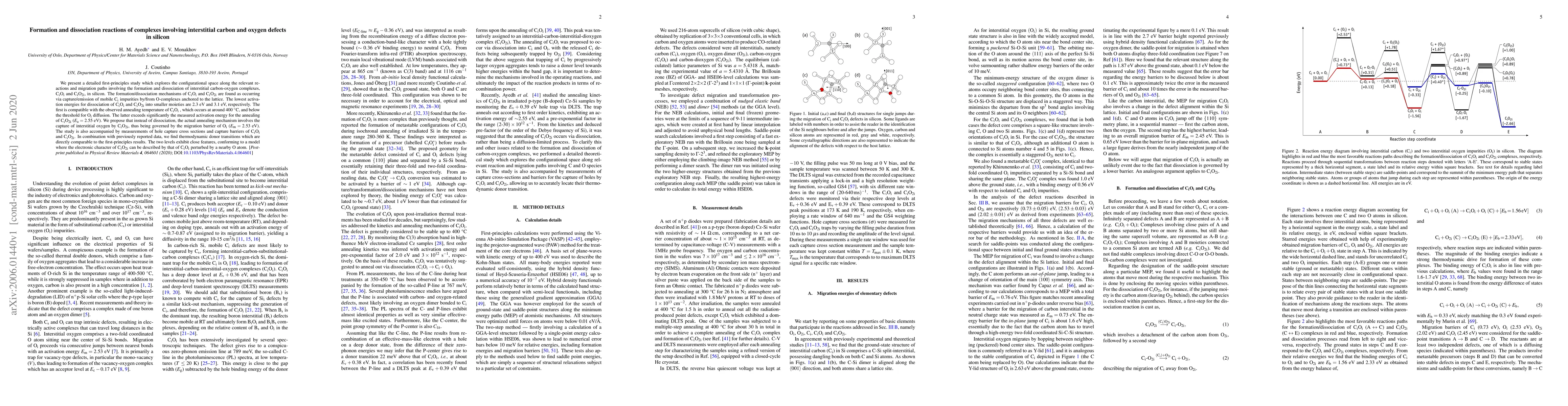 We present a detailed first-principles study which explores the configurational space along the relevant reactions and migration paths involving the formation and dissociation of interstitial carbon-oxygen complexes, $\mathrm{C_{i}O_{i}}$ and $\mathrm{C_{i}O_{2i}}$, in silicon. The formation/dissociation mechanisms of $\mathrm{C_{i}O_{i}}$ and $\mathrm{C_{i}O_{2i}}$ are found as occurring via capture/emission of mobile $\mathrm{C_{i}}$ impurities by/from O-complexes anchored to the lattice. The lowest activation energies for dissociation of $\mathrm{C_{i}O_{i}}$ and $\mathrm{C_{i}O_{2i}}$ into smaller moieties are 2.3 eV and 3.1 eV, respectively. The first is compatible with the observed annealing temperature of $\mathrm{C_{i}O_{i}}$ , which occurs at around 400 $^{\circ}$C, and below the threshold for $\mathrm{O_{i}}$ diffusion. The latter exceeds significantly the measured activation energy for the annealing of $\mathrm{C_{i}O_{2i}}$ ($E_{\mathrm{a}}=2.55$ eV). We propose that instead of dissociation, the actual annealing mechanism involves the capture of interstitial oxygen by $\mathrm{C_{i}O_{2i}}$, thus being governed by the migration barrier of $\mathrm{O_{i}}$ ($E_{\mathrm{m}}=2.53$ eV). The study is also accompanied by measurements of hole capture cross sections and capture barriers of $\mathrm{C_{i}O_{i}}$ and $\mathrm{C_{i}O_{2i}}$. In combination with previously reported data, we find thermodynamic donor transitions which are directly comparable to the first-principles results. The two levels exhibit close features, conforming to a model where the electronic character of $\mathrm{C_{i}O_{2i}}$ can be described by that of $\mathrm{C_{i}O_{i}}$ perturbed by a nearby O atom.