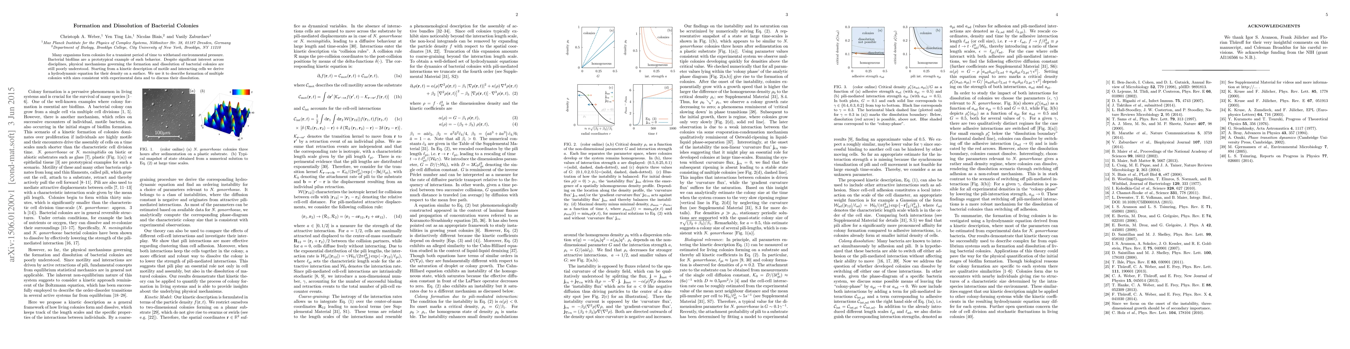 The research derives a hydrodynamic equation from a kinetic description of motile and interacting cells to study the formation and dissolution of bacterial colonies, using parameters estimable from experimental data for N. gonorrhoeae bacteria.