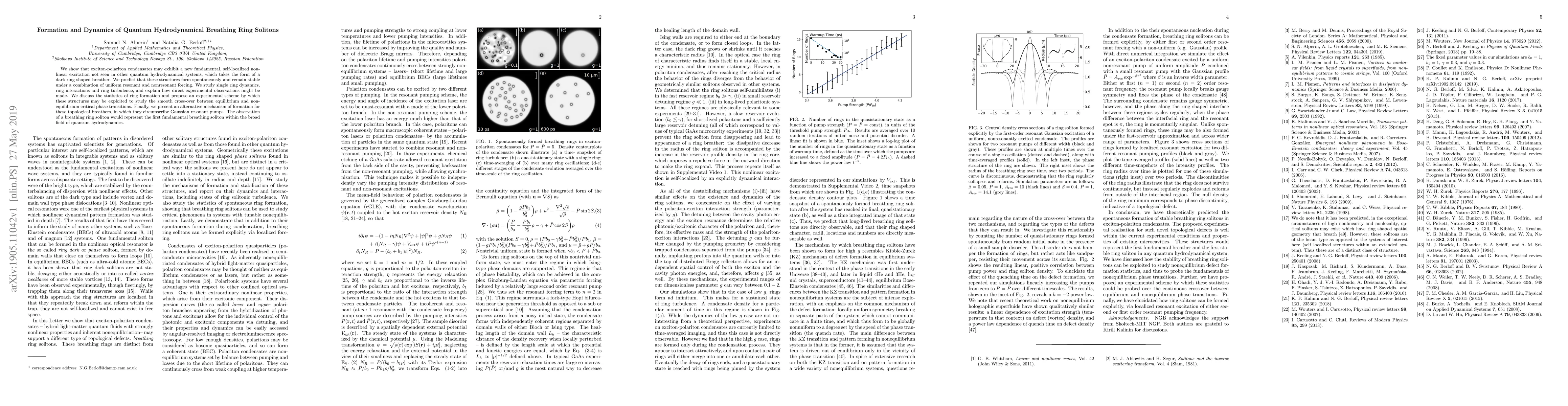 We show that exciton-polariton condensates may exhibit a new fundamental, self-localized nonlinear excitation not seen in other quantum hydrodynamical systems, which takes the form of a dark ring shaped breather. We predict that these structures form spontaneously and remain stable under a combination of uniform resonant and nonresonant forcing. We study single ring dynamics, ring interactions and ring turbulence, and explain how direct experimental observations might be made. We discuss the statistics of ring formation and propose an experimental scheme by which these structures may be exploited to study the smooth cross-over between equilibrium and non-equilibrium critical phase transitions. Finally, we present an alternative mechanism of formation for these topological breathers, in which they circumscribe Gaussian resonant pumps. The observation of a breathing ring soliton would represent the first fundamental breathing soliton within the broad field of quantum hydrodynamics.