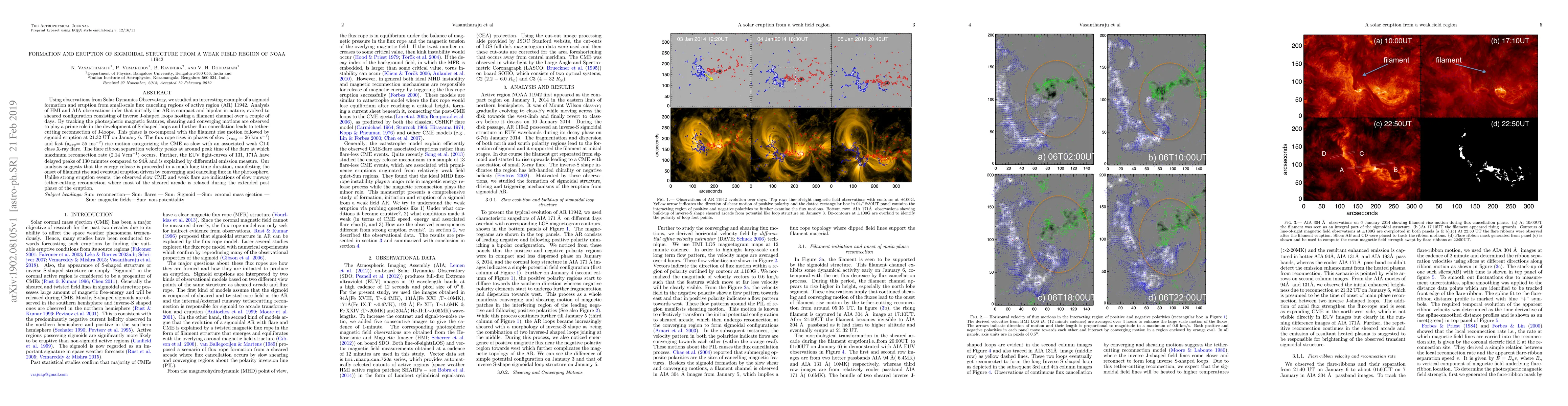 Using observations from Solar Dynamics Observatory, we studied an interesting example of a sigmoid formation and eruption from small-scale flux canceling regions of active region (AR) 11942. Analysis of HMI and AIA observations infer that initially the AR is compact and bipolar in nature, evolved to sheared configuration consisting of inverse J-shaped loops hosting a filament channel over a couple of days. By tracking the photospheric magnetic features, shearing and converging motions are observed to play a prime role in the development of S-shaped loops and further flux cancellation leads to tether-cutting reconnection of J-loops. This phase is co-temporal with the filament rise motion followed by sigmoid eruption at 21:32 UT on January 6. The flux rope rises in phases of slow (v$_{avg}$ = 26 km~s$^{-1}$) and fast (a$_{avg}$= 55 ms$^{-2}$) rise motion categorizing the CME as slow with an associated weak C1.0 class X-ray flare. The flare ribbon separation velocity peaks at around peak time of the flare at which maximum reconnection rate (2.14 Vcm$^{-1}$) occurs. Further, the EUV light-curves of 131, 171\AA~have delayed peaks of 130 minutes compared to 94\AA~and is explained by differential emission measure. Our analysis suggests that the energy release is proceeded in a much long time duration, manifesting the onset of filament rise and eventual eruption driven by converging and canceling flux in the photosphere. Unlike strong eruption events, the observed slow CME and weak flare are indications of slow runway tether-cutting reconnection where most of the sheared arcade is relaxed during the extended post phase of the eruption.