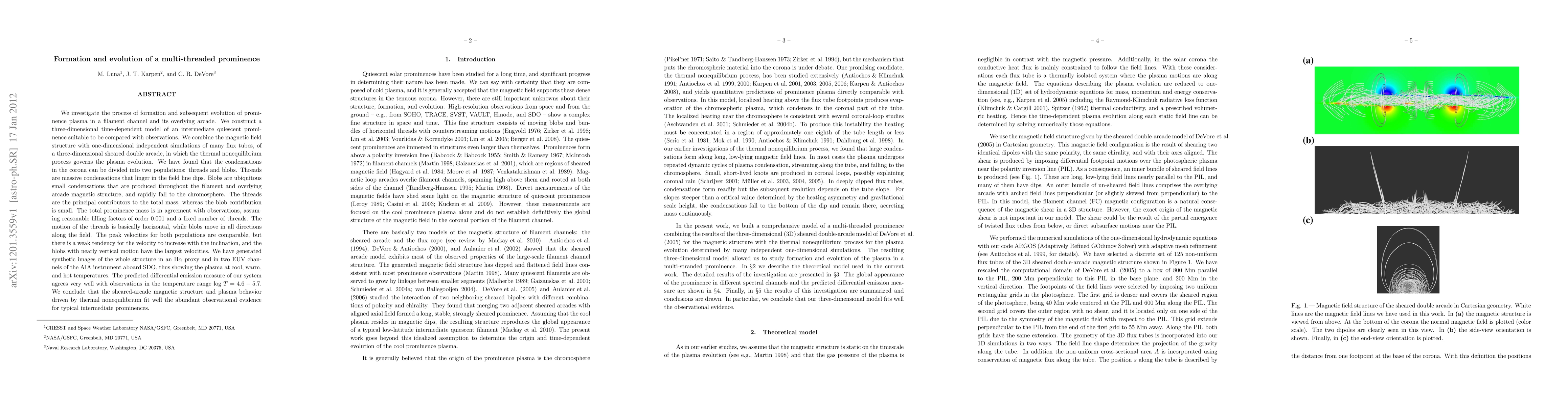 We investigate the process of formation and subsequent evolution of prominence plasma in a filament channel and its overlying arcade. We construct a three-dimensional time-dependent model of an intermediate quiescent prominence. We combine the magnetic field structure with one-dimensional independent simulations of many flux tubes, of a three-dimensional sheared double arcade, in which the thermal nonequilibrium process governs the plasma evolution. We have found that the condensations in the corona can be divided into two populations: threads and blobs. Threads are massive condensations that linger in the field line dips. Blobs are ubiquitous small condensations that are produced throughout the filament and overlying arcade magnetic structure, and rapidly fall to the chromosphere. The threads are the principal contributors to the total mass. The total prominence mass is in agreement with observations, assuming a reasonable filling factor. The motion of the threads is basically horizontal, while blobs move in all directions along the field. The peak velocities for both populations are comparable. We have generated synthetic images of the whole structure in an H$\alpha$ proxy and in two EUV channels of the AIA instrument aboard SDO, thus showing the plasma at cool, warm, and hot temperatures. The predicted differential emission measure of our system agrees very well with observations. We conclude that the sheared-arcade magnetic structure and plasma behavior driven by thermal nonequilibrium fit well the abundant observational evidence for typical intermediate prominences.