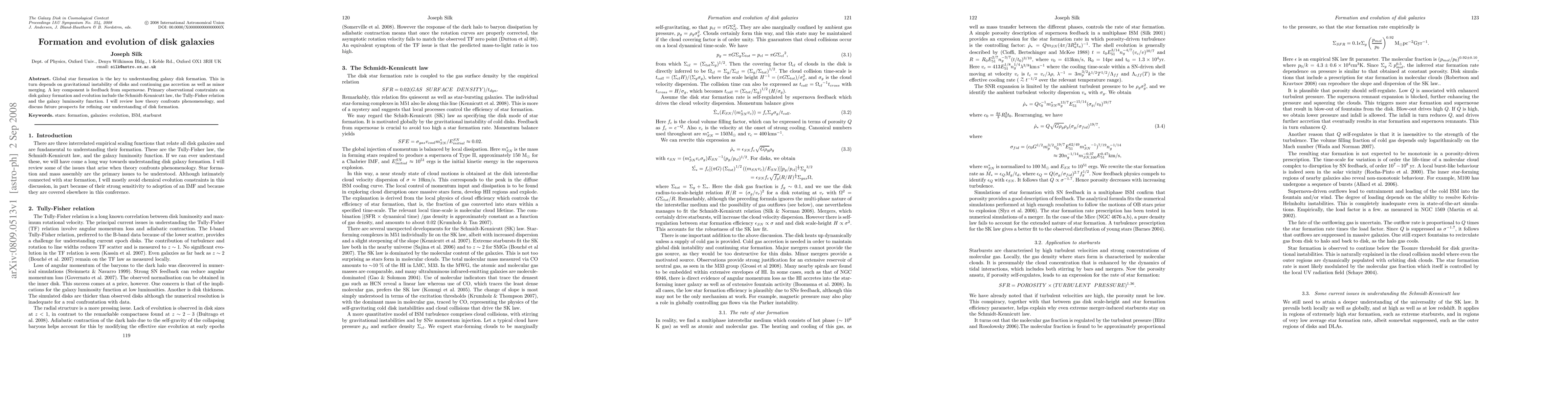 This paper reviews the formation and evolution of disk galaxies, emphasizing the role of star formation, gravitational instability, gas accretion, and supernova feedback. It discusses observational constraints like the Schmidt-Kennicutt law and future prospects for advancing our understanding of these processes.
