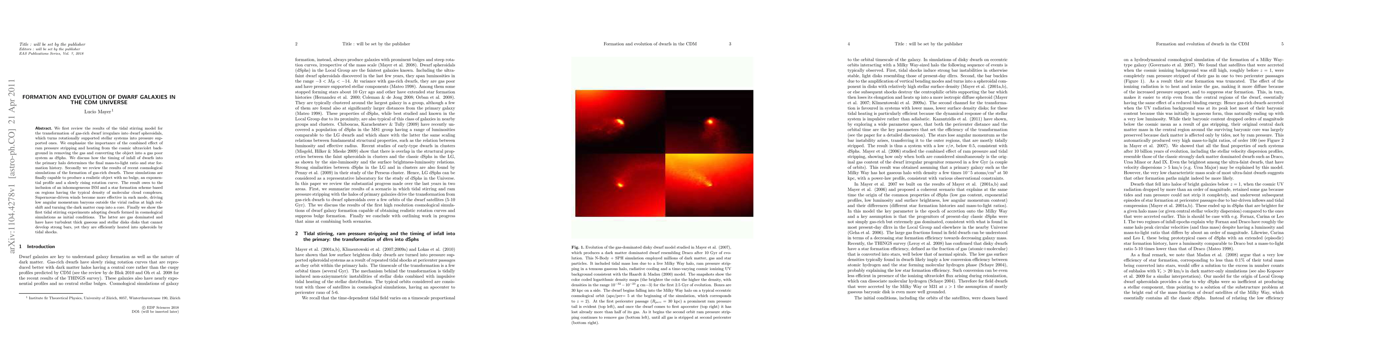 We first review the results of the tidal stirring model for the transformation of gas-rich dwarf irregulars into dwarf spheroidals, which turns rotationally supported stellar systems into pressure supported ones. We emphasize the importance of the combined effect of ram pressure stripping and heating from the cosmic ultraviolet background in removing the gas and converting the object into a gas poor system as dSphs. We discuss how the timing of infall of dwarfs into the primary halo determines the final mass-to-light ratio and star formation history. Secondly we review the results of recent cosmological simulations of the formation of gas-rich dwarfs. These simulations are finally capable to produce a realistic object with no bulge, an exponential profile and a slowly rising rotation curve. The result owes to the inclusion of an inhomogeneous ISM and a star formation scheme based on regions having the typical density of molecular cloud complexes. Supernovae-driven winds become more effective in such mode, driving low angular momentum baryons outside the virial radius at high redshift and turning the dark matter cusp into a core. Finally we show the first tidal stirring experiments adopting dwarfs formed in cosmological simulations as initial conditions. The latter are gas dominated and have have turbulent thick gaseous and stellar disks disks that cannot develop strong bars, yet they are efficiently heated into spheroids by tidal shocks.