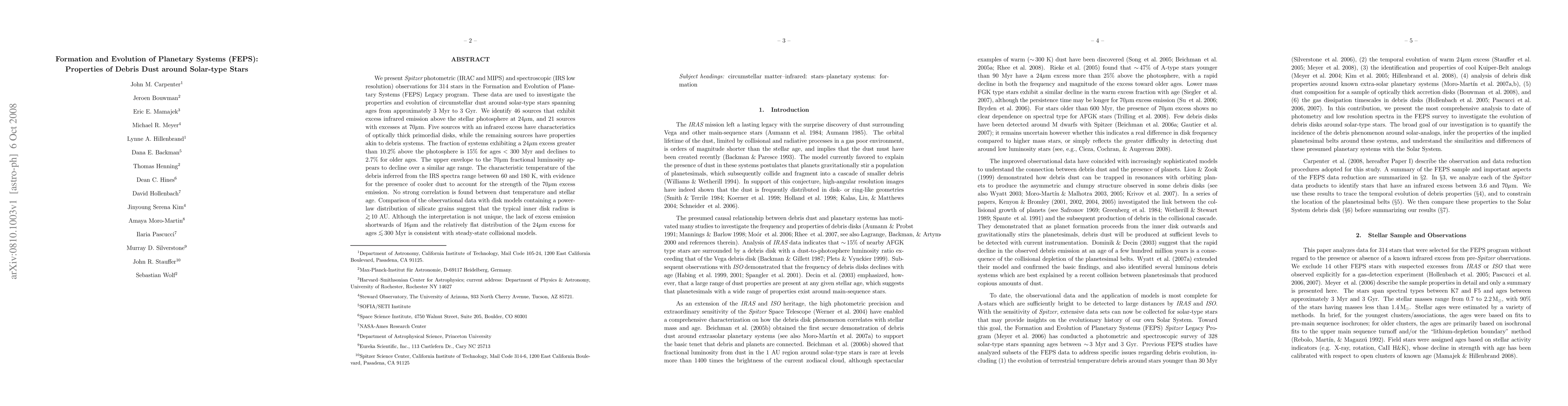 We present Spitzer photometric (IRAC and MIPS) and spectroscopic (IRS low resolution) observations for 314 stars in the Formation and Evolution of Planetary Systems (FEPS) Legacy program. These data are used to investigate the properties and evolution of circumstellar dust around solar-type stars spanning ages from approximately 3 Myr to 3 Gyr. We identify 46 sources that exhibit excess infrared emission above the stellar photosphere at 24um, and 21 sources with excesses at 70um. Five sources with an infrared excess have characteristics of optically thick primordial disks, while the remaining sources have properties akin to debris systems. The fraction of systems exhibiting a 24um excess greater than 10.2% above the photosphere is 15% for ages < 300 Myr and declines to 2.7% for older ages. The upper envelope to the 70um fractional luminosity appears to decline over a similar age range. The characteristic temperature of the debris inferred from the IRS spectra range between 60 and 180 K, with evidence for the presence of cooler dust to account for the strength of the 70um excess emission. No strong correlation is found between dust temperature and stellar age. Comparison of the observational data with disk models containing a power-law distribution of silicate grains suggest that the typical inner disk radius is > 10 AU. Although the interpretation is not unique, the lack of excess emission shortwards of 16um and the relatively flat distribution of the 24um excess for ages <300~Myr is consistent with steady-state collisional models.