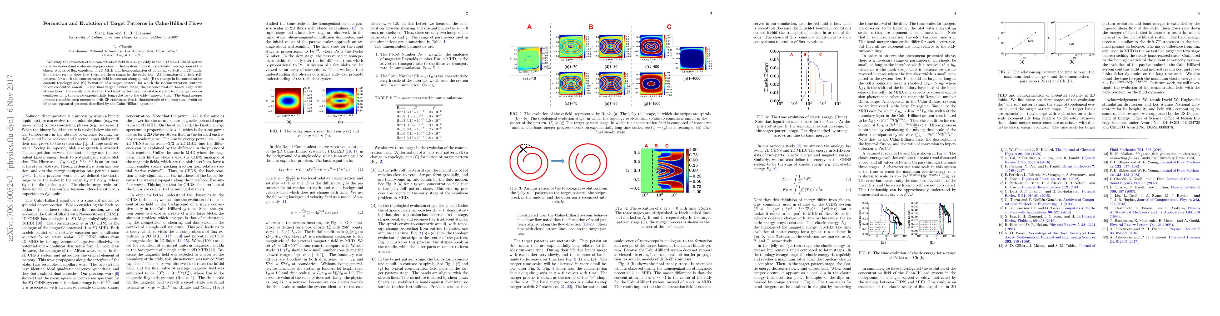 We study the evolution of the concentration field in a single eddy in the 2D Cahn-Hilliard system to better understand scalar mixing processes in that system. This study extends investigations of the classic studies of flux expulsion in 2D MHD and homogenization of potential vorticity in 2D fluids. Simulation results show that there are three stages in the evolution: (A) formation of a jelly roll pattern, for which the concentration field is constant along spirals; (B) a change in isoconcentration contour topology; and (C) formation of a target pattern, for which the isoconcentration contours follow concentric annuli. In the final target pattern stage, the isoconcentration bands align with stream lines. The results indicate that the target pattern is a metastable state. Band merger process continues on a time scale exponentially long relative to the eddy turnover time. The band merger process resembles step merger in drift-ZF staircases; this is characteristic of the long-time evolution of phase separated patterns described by the Cahn-Hilliard equation.