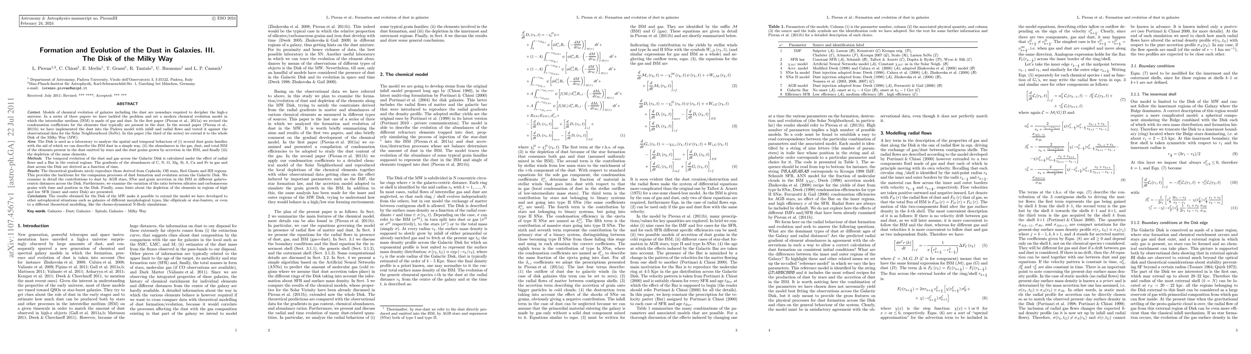 Models of chemical evolution of galaxies including the dust are nowadays required to decipher the high-z universe. In a series of three papers we have tackled the problem and set a modern chemical evolution model. In the first paper (Piovan et al., 2011a) we revised the condensation coefficients for the elements that typically are present in the dust. In the second paper (Piovan et al., 2011b) we have implemented the dust into the Padova chemical model and tested it against the observational data for the Solar Neighbourhood. In this paper we extend it to the whole Disk of the Milky Way (MW). The Disk is used as a laboratory to analyze the spatial and temporal behaviour of (i) several dust grain families with the aid of which we can describe the ISM, (ii) the abundances in the gas, dust, and total ISM of the elements present in the dust and (iii) the depletion of the same elements. The temporal evolution of the dust and gas across the Disk is calculated under the effect of radial flows and a central Bar. The gradients of the abundances of C, N, O, Mg, Si, S, Ca and Fe in gas and dust across the Disk are derived as a function of time. The theoretical gradients nicely reproduce those derived from Cepheids, OB stars, Red Giants and HII regions. This provides the backbone for the companion processes of dust formation and evolution across the Disk. We examine in detail the contributions to dust by AGB stars, SNae and grain accretion in the ISM at different galacto-centric distances. Furthermore, we examine the variation of the ratio silicates/carbonaceous grains with time and position in the Disk. Finally, some hints about the depletion of the elements in regions of high and low SFR (inner and outer Disk) are presented. The results obtained make it possible to extend the model to other astrophysical situations or different theoretical models like the chemo-dynamical N-Body simulations.