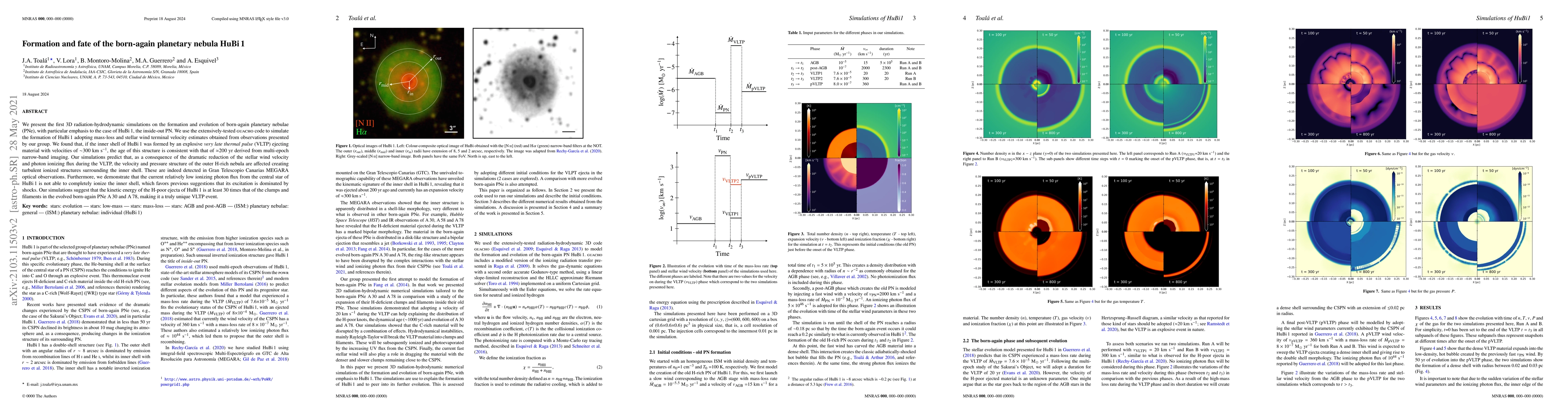 We present the first 3D radiation-hydrodynamic simulations on the formation and evolution of born-again planetary nebulae (PNe), with particular emphasis to the case of HuBi1, the inside-out PN. We use the extensively-tested GUACHO code to simulate the formation of HuBi1 adopting mass-loss and stellar wind terminal velocity estimates obtained from observations presented by our group. We found that, if the inner shell of HuBi1 was formed by an explosive very late thermal pulse (VLTP) ejecting material with velocities of $\sim$300 km s$^{-1}$, the age of this structure is consistent with that of $\simeq$200 yr derived from multi-epoch narrow-band imaging. Our simulations predict that, as a consequence of the dramatic reduction of the stellar wind velocity and photon ionizing flux during the VLTP, the velocity and pressure structure of the outer H-rich nebula are affected creating turbulent ionized structures surrounding the inner shell. These are indeed detected in Gran Telescopio Canarias MEGARA optical observations. Furthermore, we demonstrate that the current relatively low ionizing photon flux from the central star of HuBi1 is not able to completely ionize the inner shell, which favors previous suggestions that its excitation is dominated by shocks. Our simulations suggest that the kinetic energy of the H-poor ejecta of HuBi1 is at least 30 times that of the clumps and filaments in the evolved born-again PNe A30 and A78, making it a truly unique VLTP event.