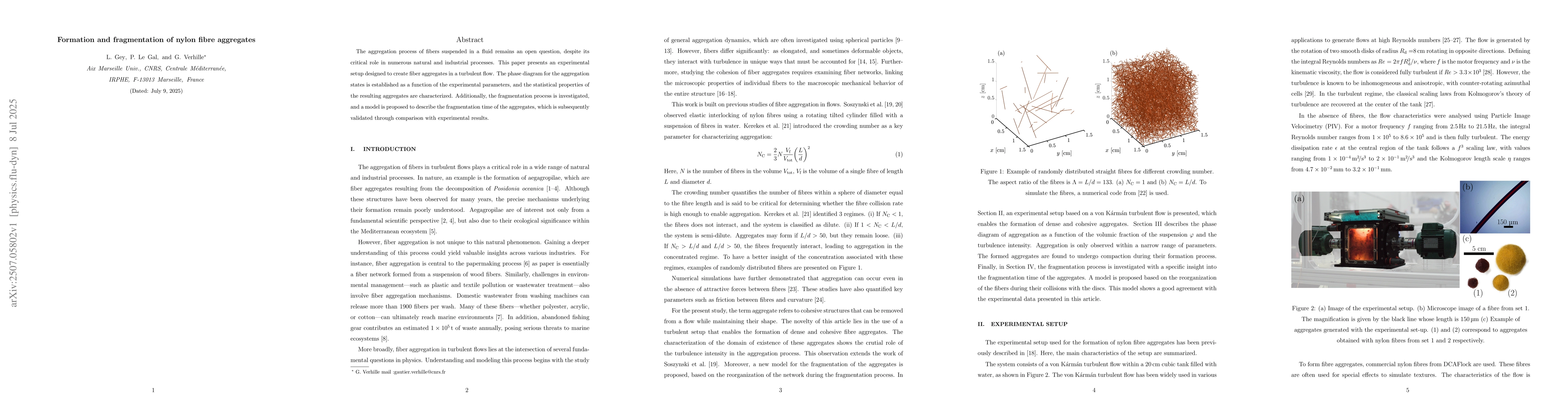 The aggregation process of fibers suspended in a fluid remains an open question, despite its critical role in numerous natural and industrial processes. This paper presents an experimental setup designed to create fiber aggregates in a turbulent flow. The phase diagram for the aggregation states is established as a function of the experimental parameters, and the statistical properties of the resulting aggregates are characterized. Additionally, the fragmentation process is investigated, and a model is proposed to describe the fragmentation time of the aggregates, which is subsequently validated through comparison with experimental results.
